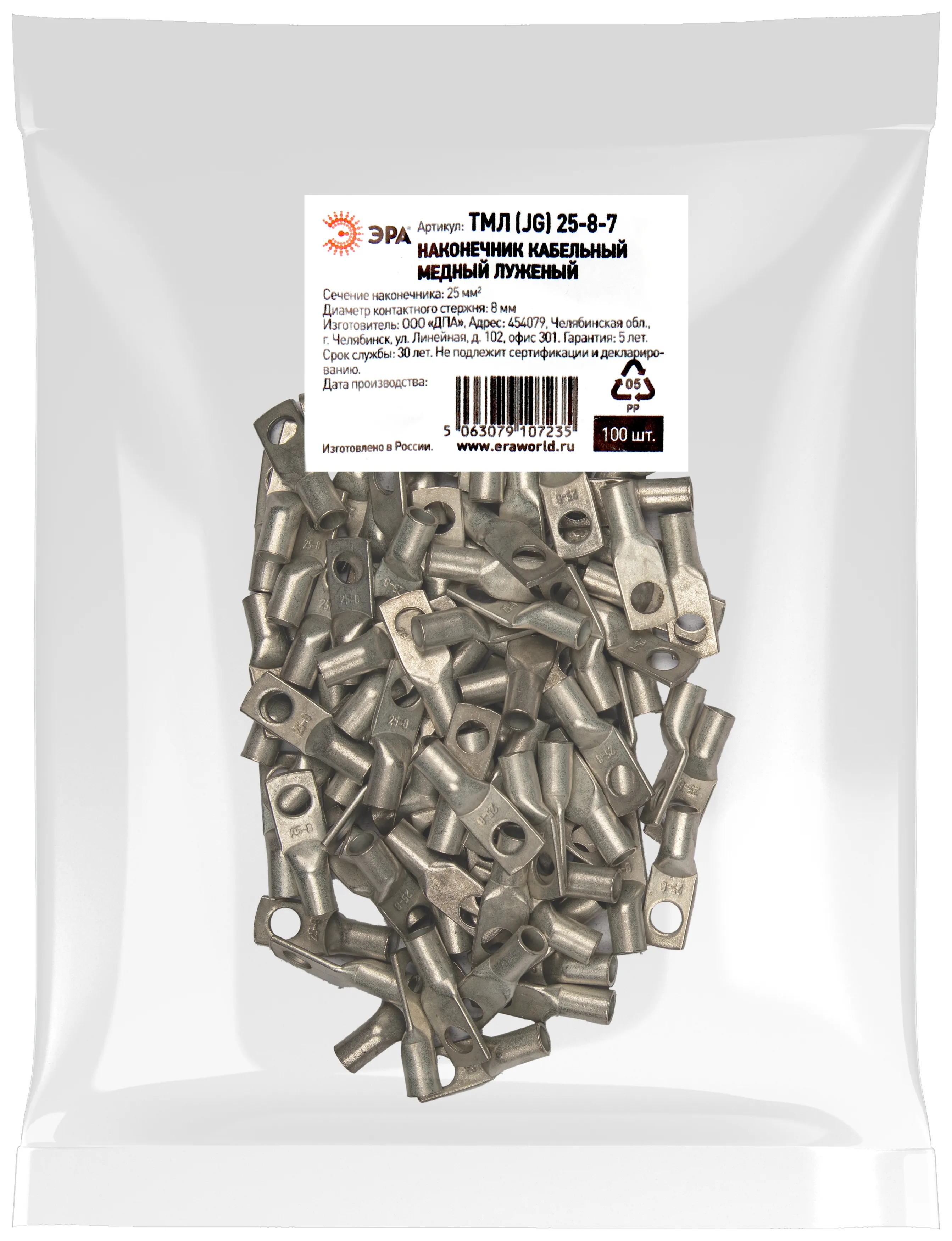 Наконечник кабельный медный луженый ЭРА ТМЛ (JG) 25-8-7 используется для оконцевания проводов и кабелей с медными жилами сечением до 25 мм² и применяется для кабелей напряжением до 10 кВ.
