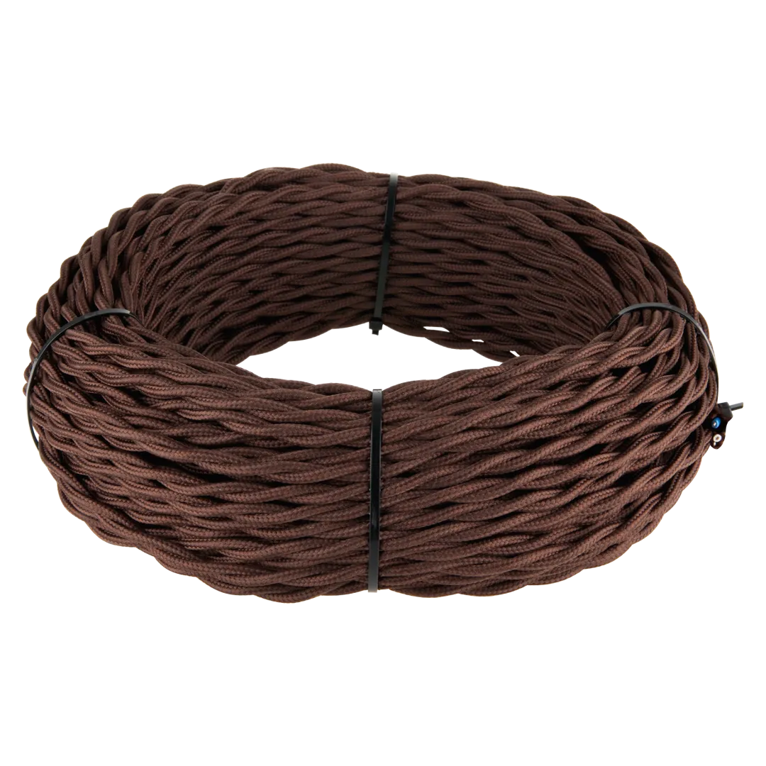 Ретро кабель витой 2х1,5 коричневый 20 м. Многожильный медный провод обеспечивает гибкость кабеля и его высокие электротехнические характеристики. Наружная оплетка кабеля имитирует натуральный шелк.