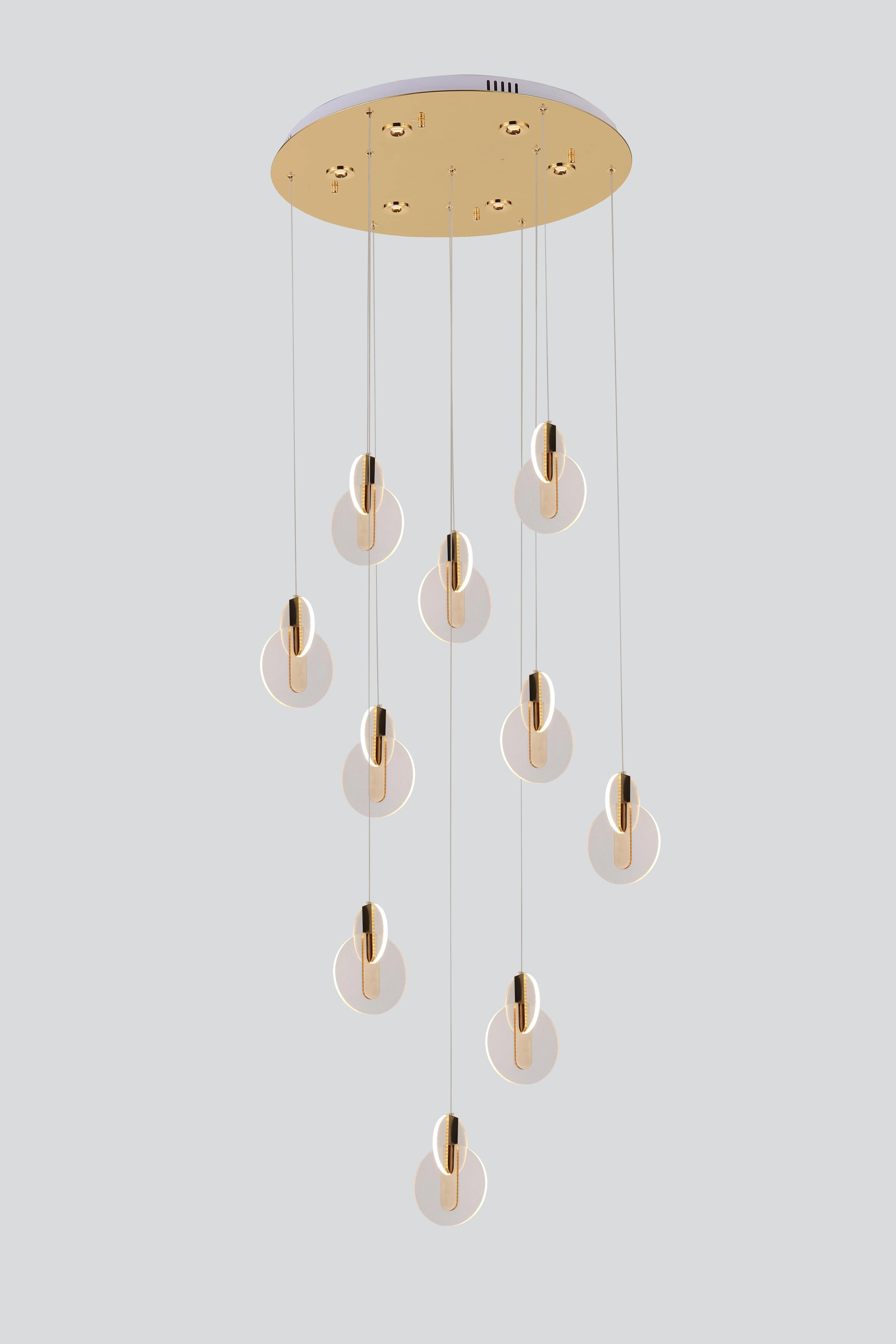 Прозрачные плафоны и арматура цвета золота создают уникальную атмосферу, подчеркивая вашу индивидуальность. Люстра оснащена 10 светодиодными лампами. Высококачественные материалы, такие как нержавейка и акрил, гарантируют долговечность и легкий уход за освещением. Высота данной модели 2000 мм, диаметр 600 мм, что позволяет осветить площадь от от 20 до 25 квадратных метров.