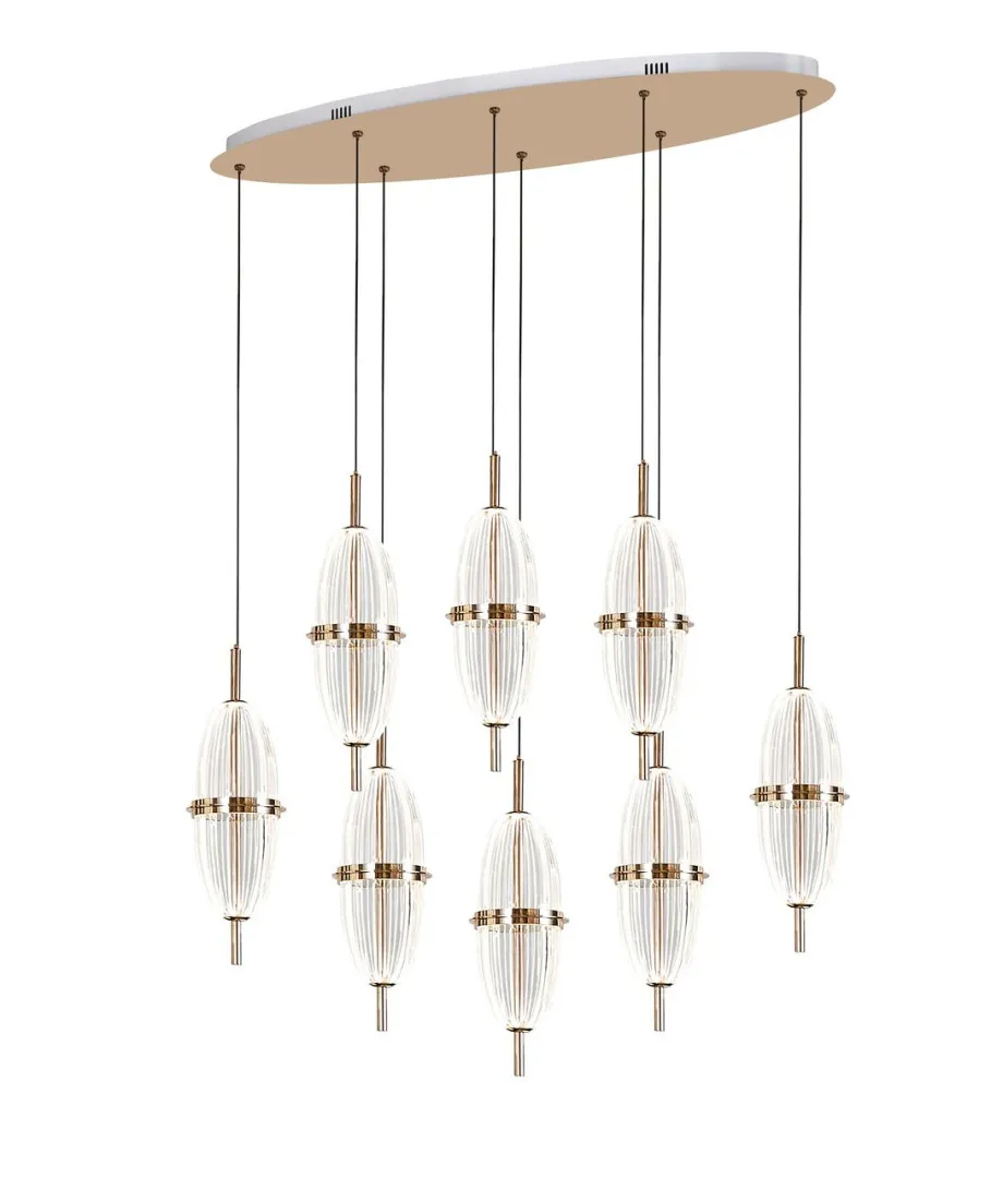 Подвесная люстра в стиле неоклассика и модерн воплощает в себе гармонию между строгими линиями и современными элементами. Изготовленная из нержавейки и акрила, она имеет прозрачные плафоны, которые усиливают игру света, создавая очаровательные отражения и тени. Золотистый цвет арматуры добавляет элегантности и позволяет люстре легко вписаться в любой интерьер.Эти люстры предлагают разнообразие размеров и характеристик, чтобы удовлетворить любые потребности. Высота данной модели 1500 мм, длина 800 мм, что позволяет освещать пространство от 10 до 15 квадратных метров. Она оснащена 8 светодиодными лампами. Приобретайте оптом и в розницу с доставкой по всей России от Alfa Light и создайте уют и комфорт в своем доме!