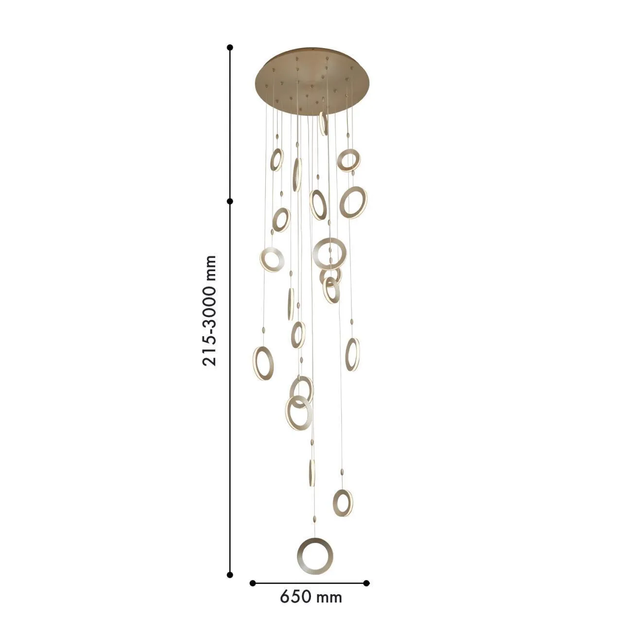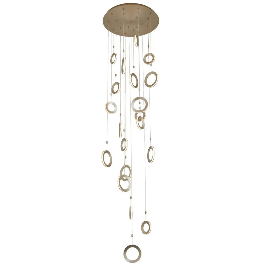 Каскадная люстра, каркас цвета матовое золото, объемные кольца цвета матовое золото, закреплены на разной высоте, светятся по периметру благодаря встроенной ленте LED, все подвесы регулируются по высоте.