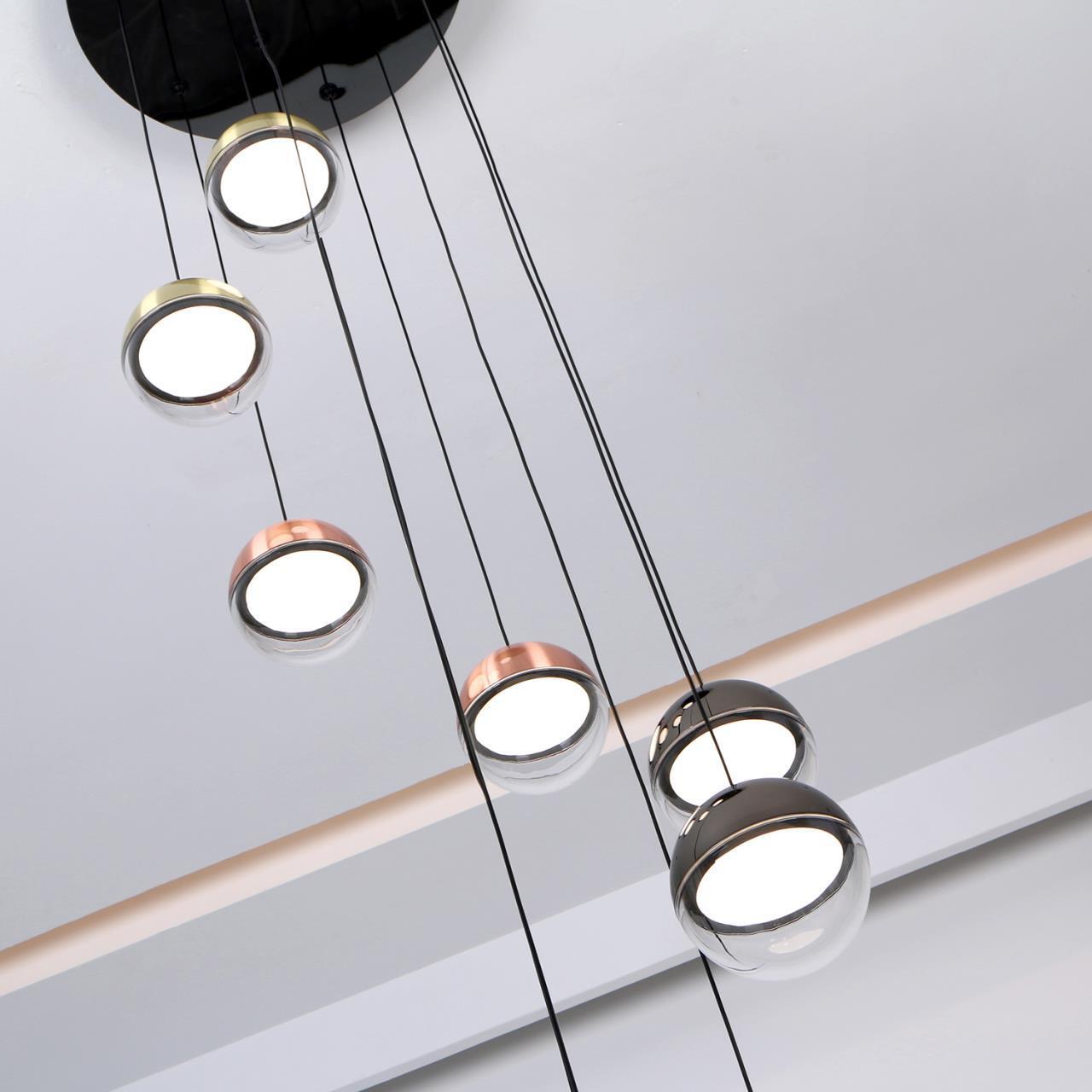 Каскадная люстра с черным каркасом, с шарообразными плафонами трех цветов (черный глянцевый, золото, розовое золото), разделенными на две части — металлическую и акриловую, в центре плафона расположен LEDмодуль, создающий оригинальный световой эффект, регулируемая высота.