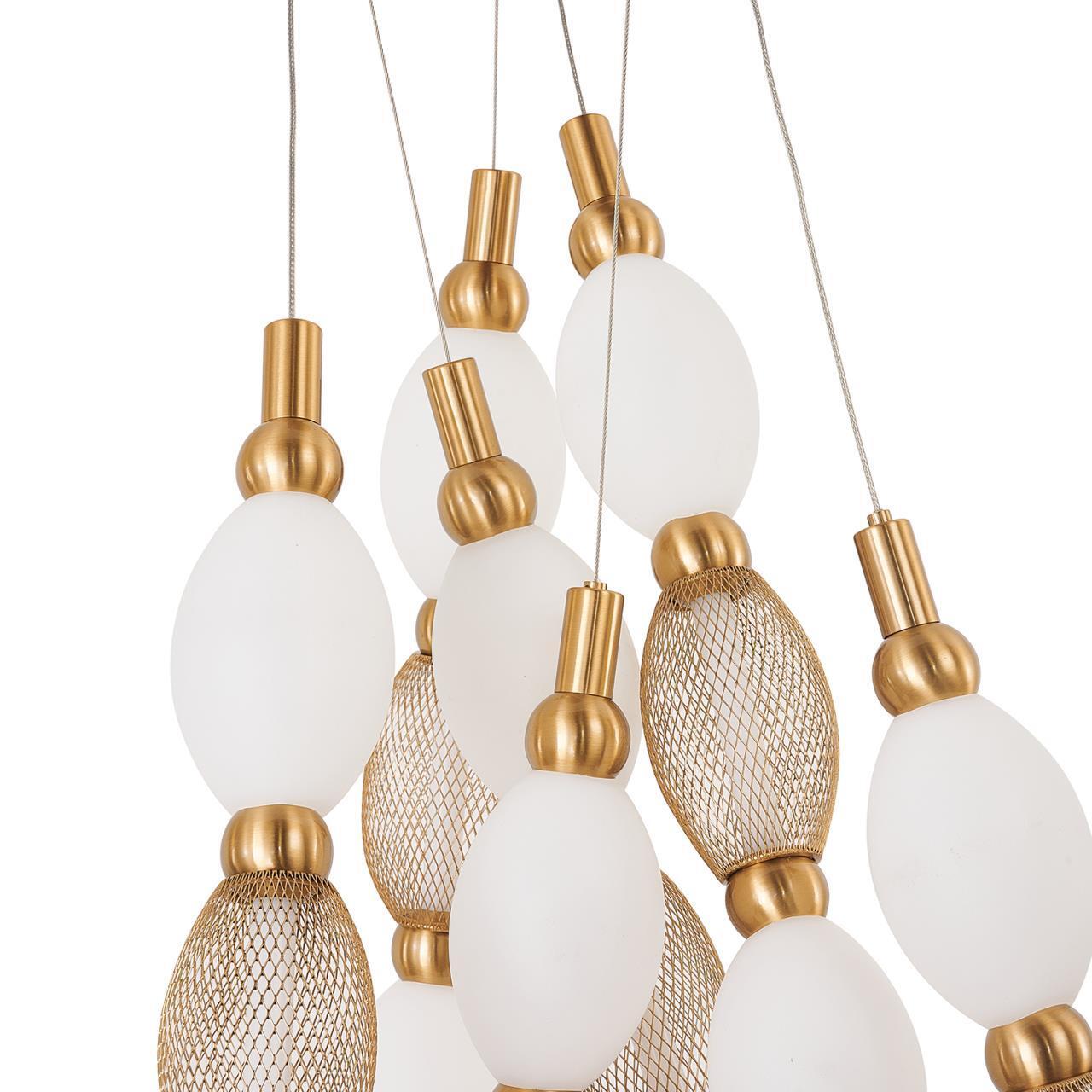 Металлический каркас цвета латунь, гибкая силиконовая трубка со встроенной лентой LED и нанизанными плафонами из белого акрила и декоративной металлической сетки. Варианты крепления: на потолок, стены, включая вариант с фиксацией от потолка до пола.