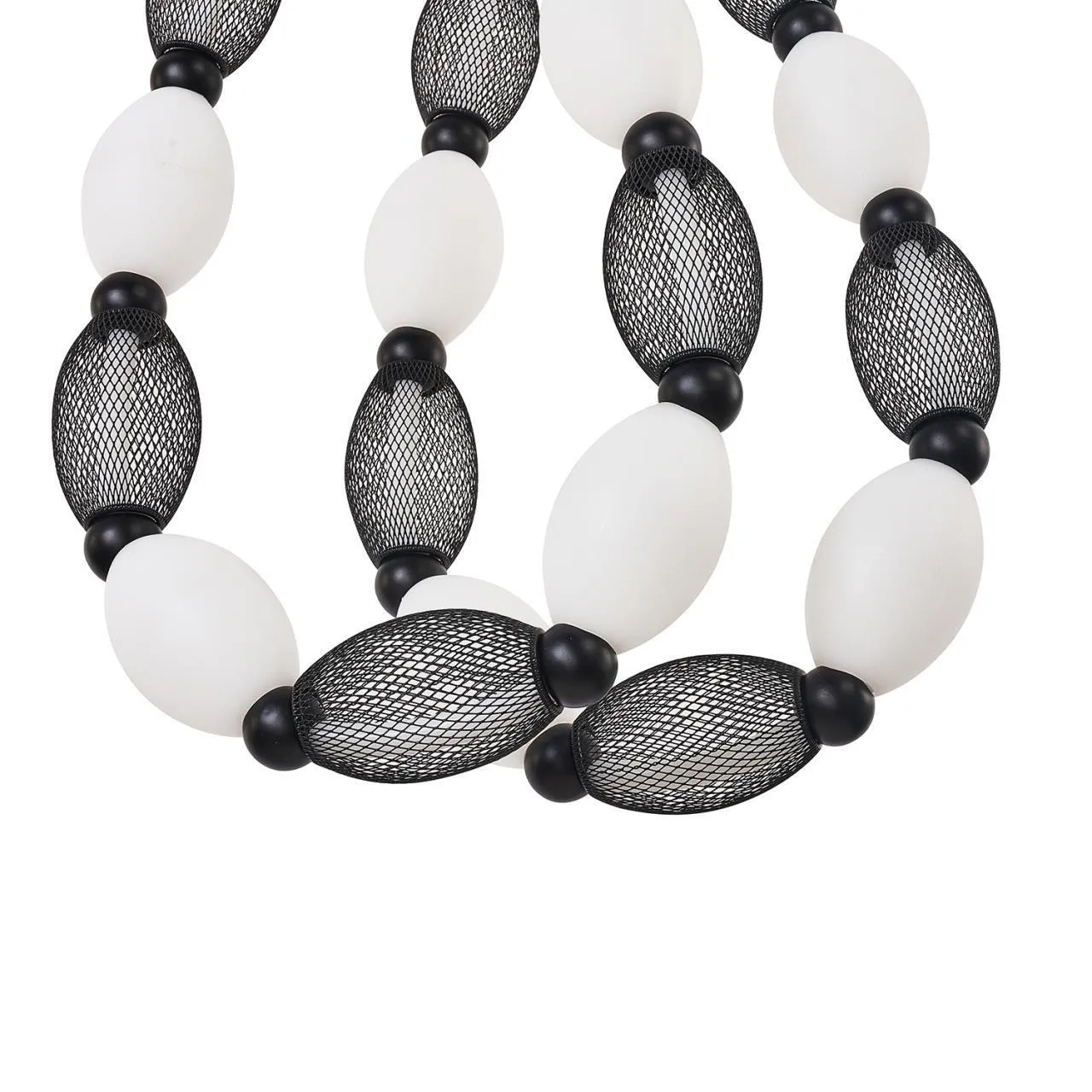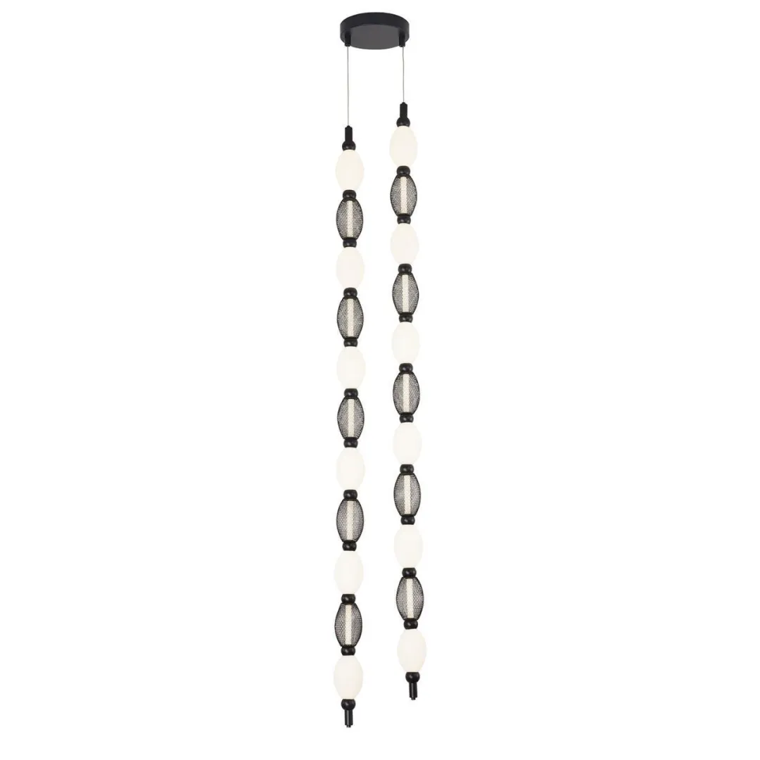Металлический каркас черного цвета, гибкая силиконовая трубка со встроенной лентой LED и нанизанными плафонами из белого акрила и декоративной металлической сетки. Варианты крепления: на потолок, стены, включая вариант с фиксацией от потолка до пола.