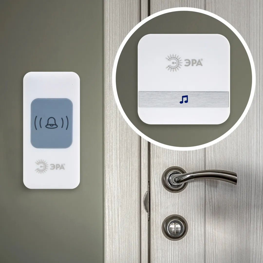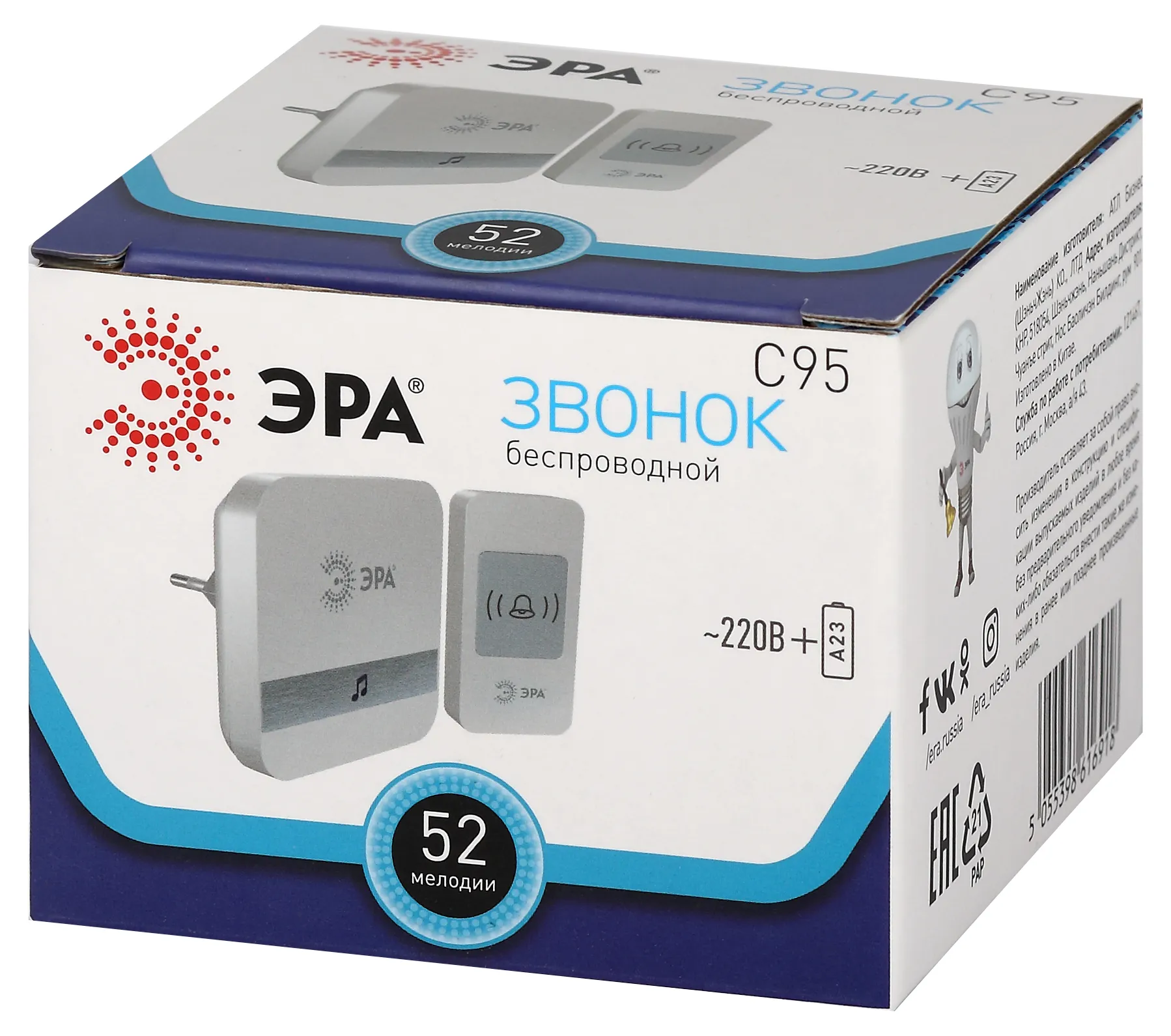 ЭРА С95 – беспроводной дверной звонок со встроенной вилкой для простого и быстрого подключения к электросети. Современный квадратный дизайн, компактный плоский корпус, базовый белый цвет. Чтобы установить звонок, нужно просто воткнуть вилку в розетку. На выбор предусмотрено 52 полифонические мелодии. Минималистичный дизайн отлично смотрится. Кнопка звонка работает от батарейки А23 (в комплекте) и легко крепится на саморезы или самоклеящуюся основу. Крепежи вы найдете в коробке. Монтаж нового дверного звонка займет у вас пару минут! Белый звонок дверной ЭРА С95 - арт. Б0054088, чёрный звонок дверной ЭРА С94 - арт. Б0054085.