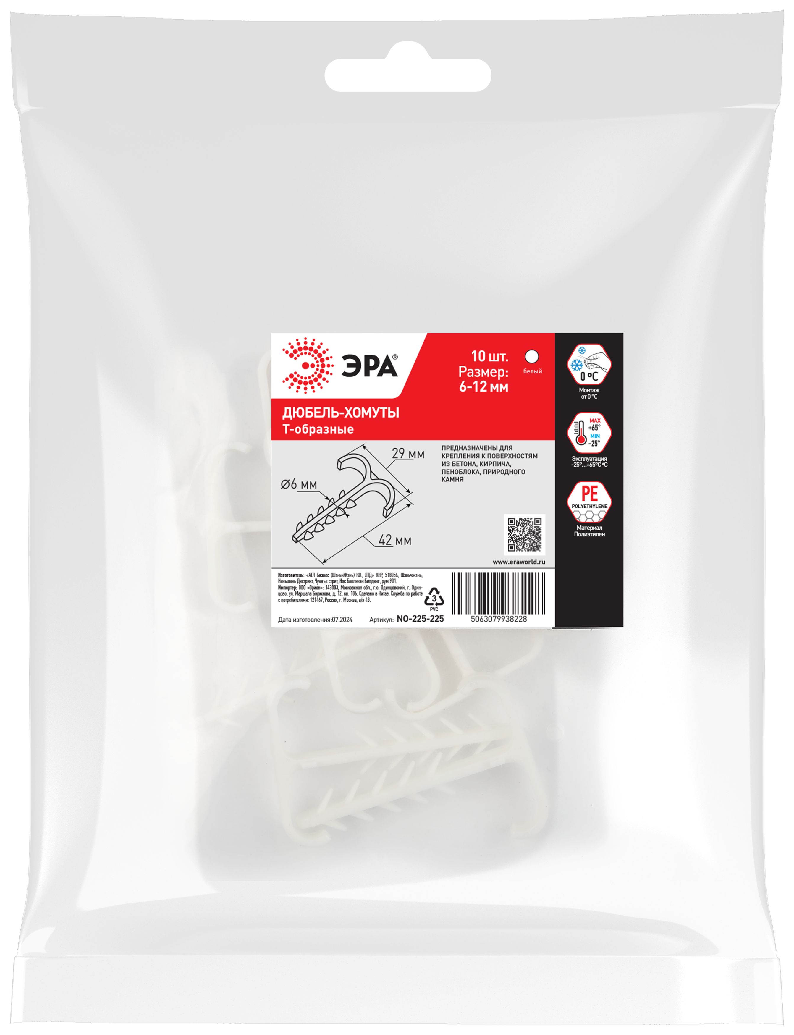 Дюбель-хомуты ЭРА Т-образные предназначены для крепления плоских проводников к кирпичным и бетонным стенам, а также стенам, выполненным из пеноблоков и природного камня. Изделия сочетают в себе сразу два элемента: дюбель и скобу, что позволяет проложить 2 кабеля одновременно как вертикально, так и горизонтально. Одинаково эффективны при прокладке кабеля в кирпичных и блочных стенах, бетонных перекрытиях, потолках, полах и фундаментах.