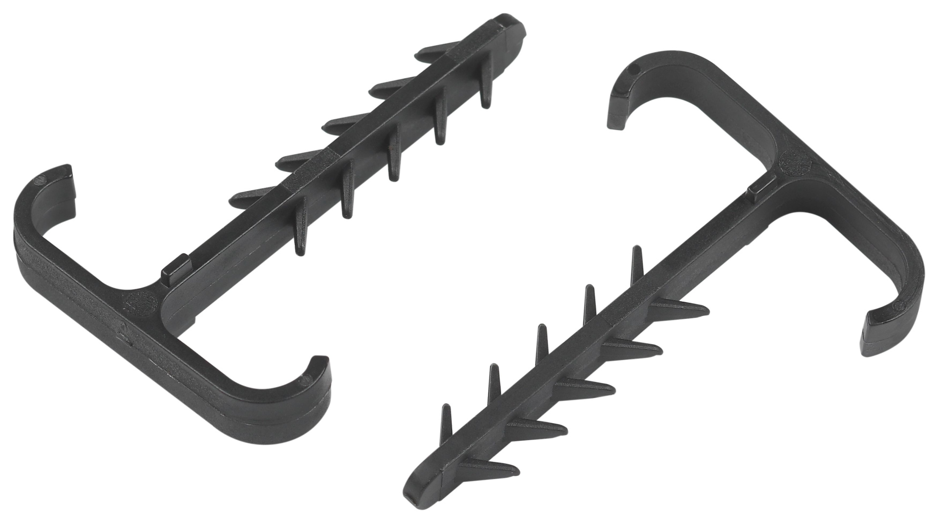 - Cочетает в себе сразу два элемента: дюбель и скобу, что позволяет проложить 2 кабеля одновременно как вертикально, так и горизонтально.