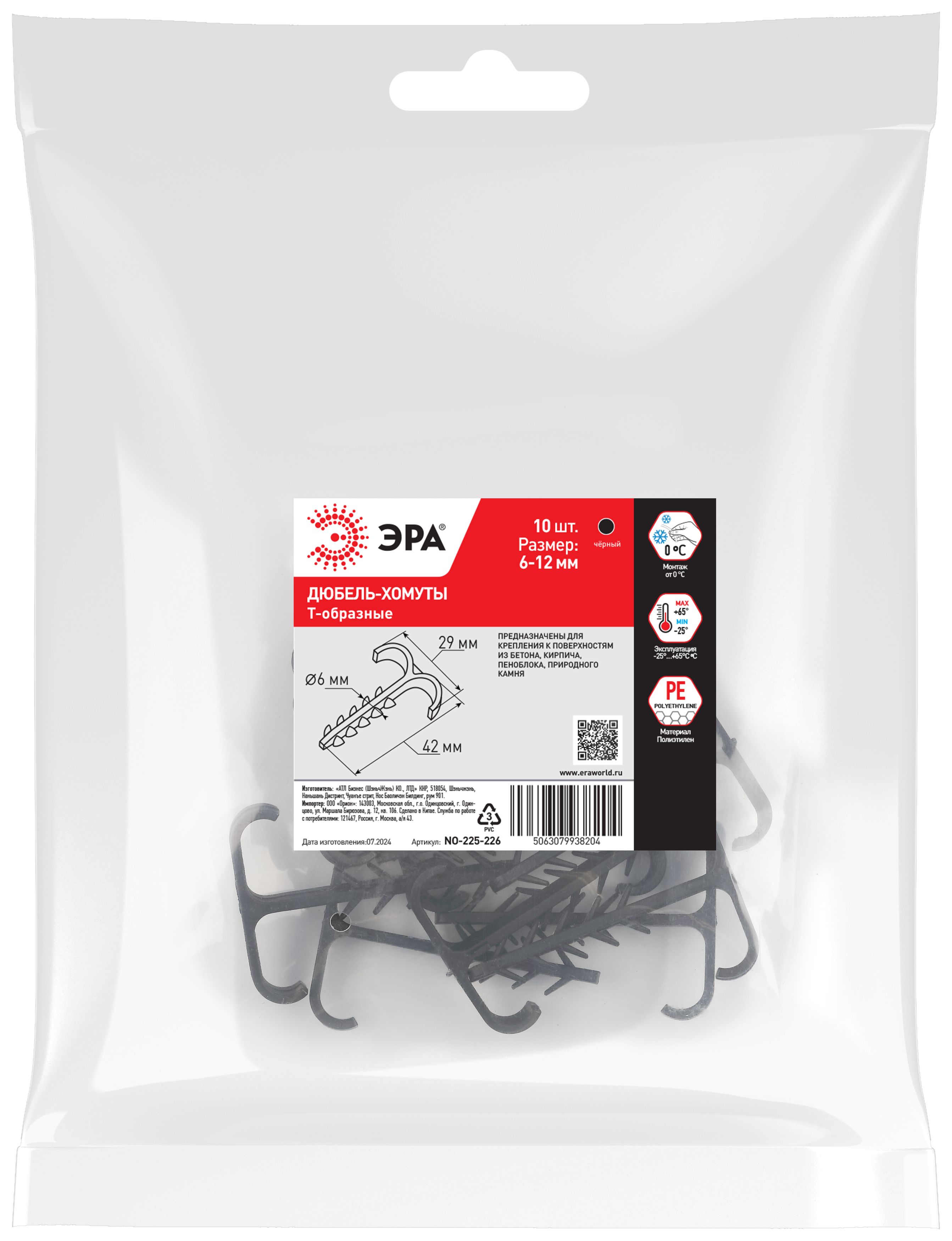 Дюбель-хомуты ЭРА Т-образные предназначены для крепления плоских проводников к кирпичным и бетонным стенам, а также стенам, выполненным из пеноблоков и природного камня. Изделия сочетают в себе сразу два элемента: дюбель и скобу, что позволяет проложить 2 кабеля одновременно как вертикально, так и горизонтально. Одинаково эффективны при прокладке кабеля в кирпичных и блочных стенах, бетонных перекрытиях, потолках, полах и фундаментах.