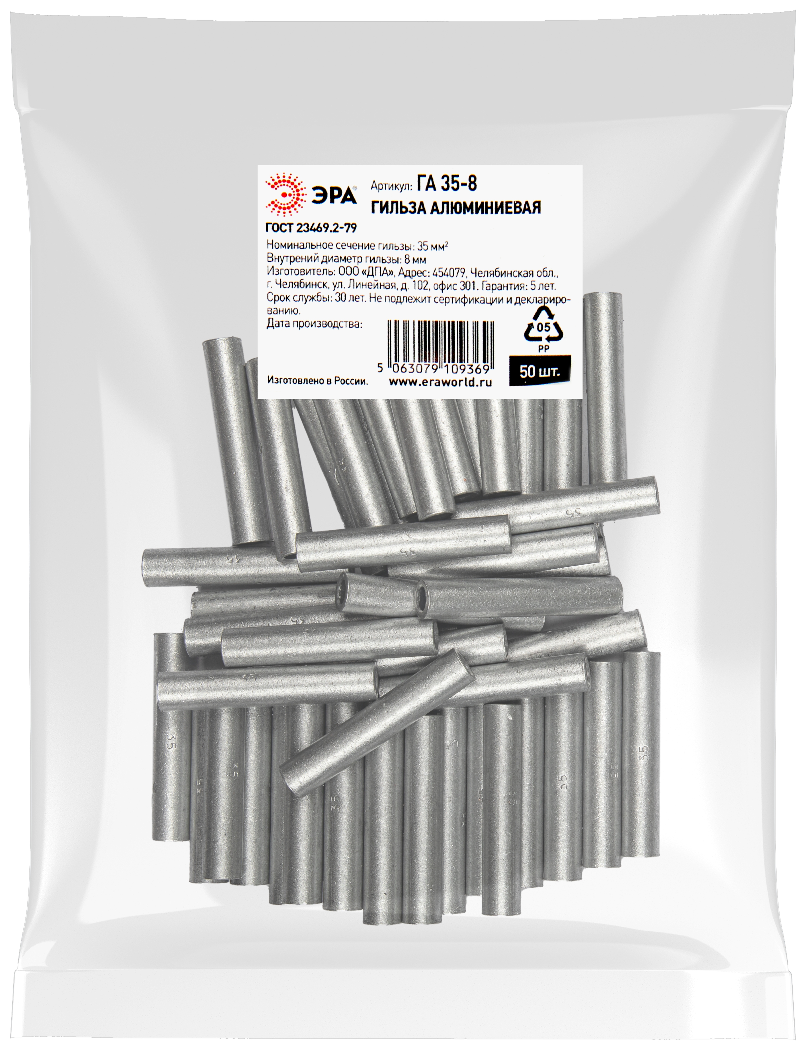 Гильза алюминиевая ЭРА ГА 35-8 используется для соединения алюминиевых жил проводов и кабелей с сечением до 35 мм² и применяется для кабелей напряжением до 35 кВ.