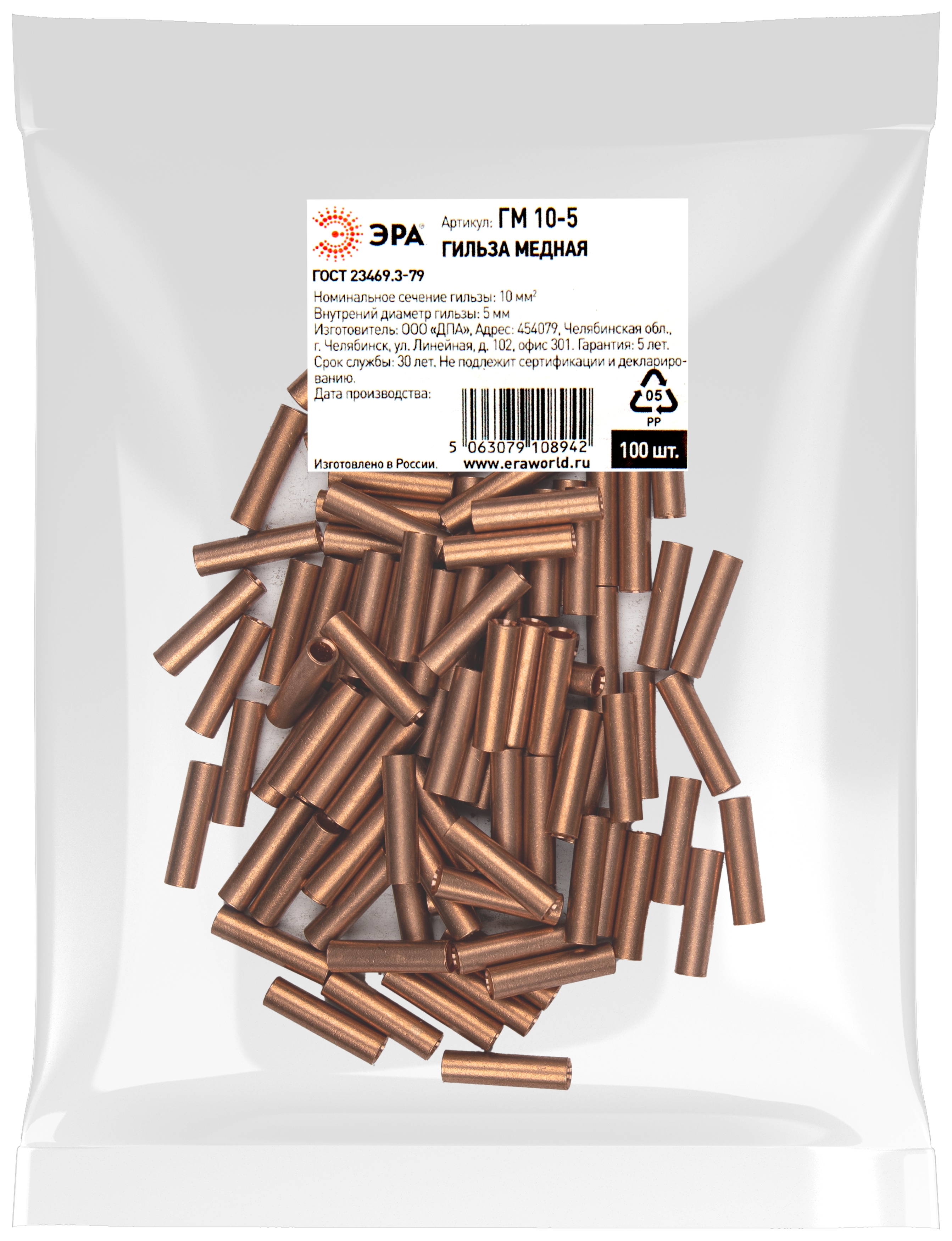 Гильза медная ЭРА ГМ 10-5 используется для соединения медных жил проводов и кабелей с сечением до 10 мм² и применяется для кабелей напряжением до 10 кВ.