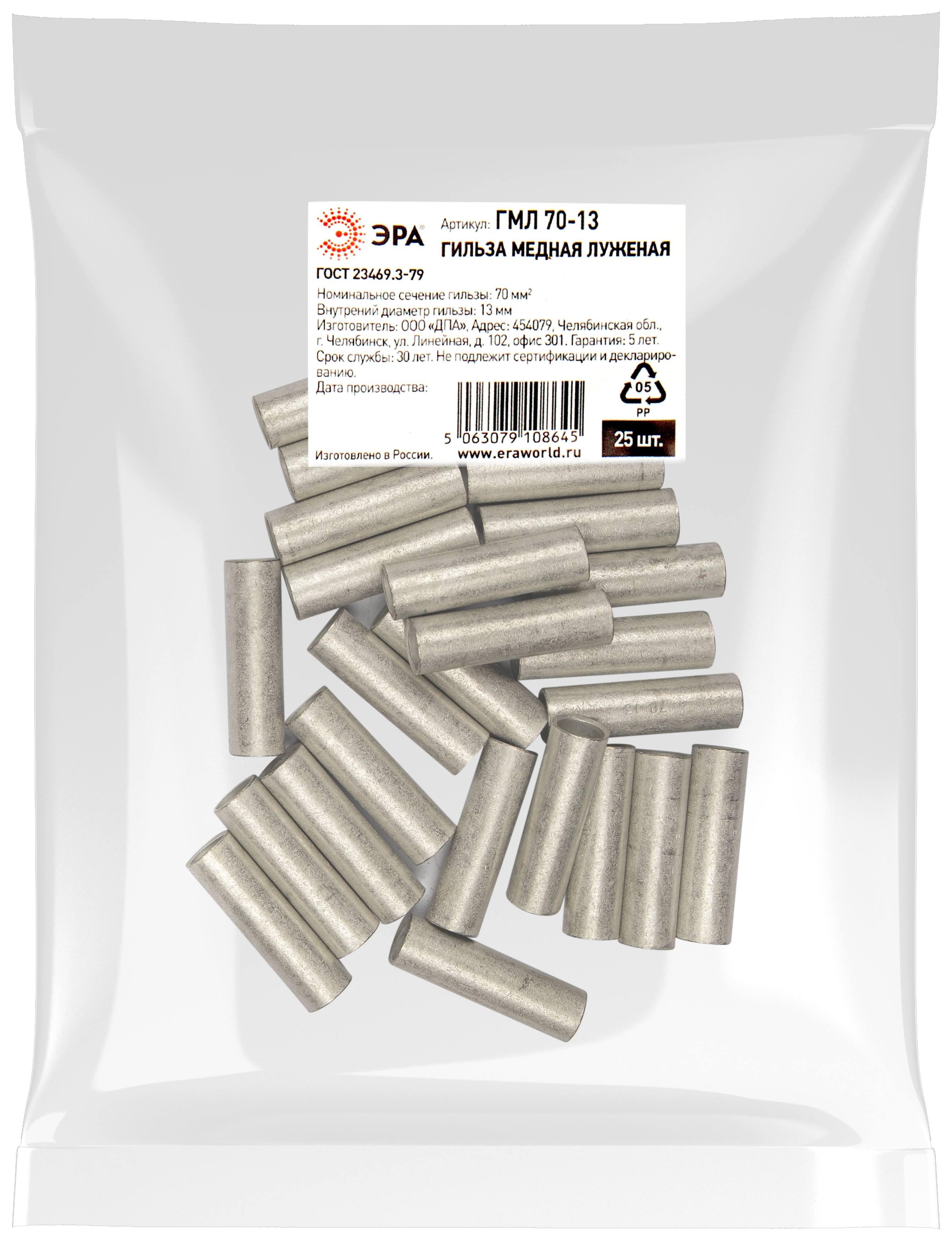 Гильза медная луженая ЭРА ГМЛ 70-13 используется для соединения медных жил проводов и кабелей с сечением до 95 мм² и применяется для кабелей напряжением до 10 кВ.