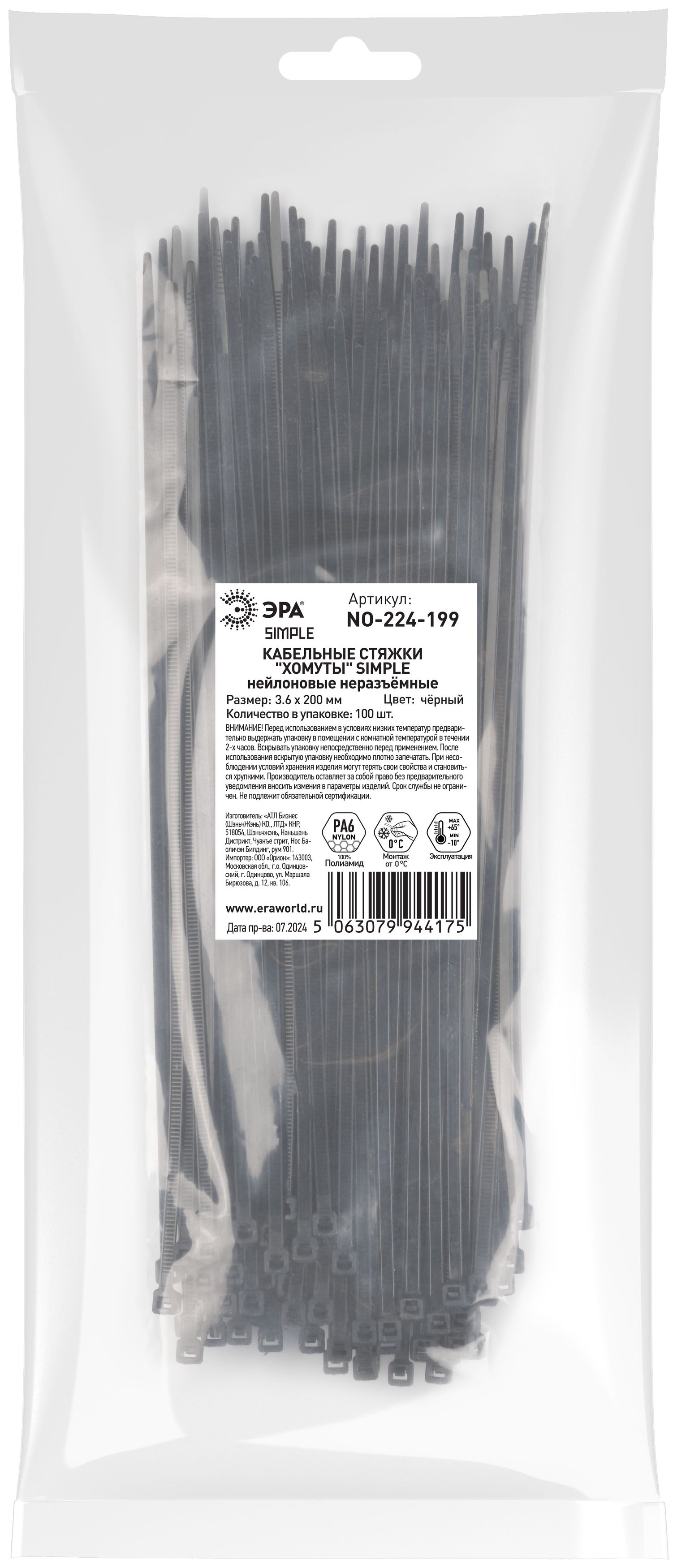 Кабельная стяжка эра no-224-200 (хомут) нейлоновая 3.6 х 250 мм чёрная (100 шт/уп) simple б0066035