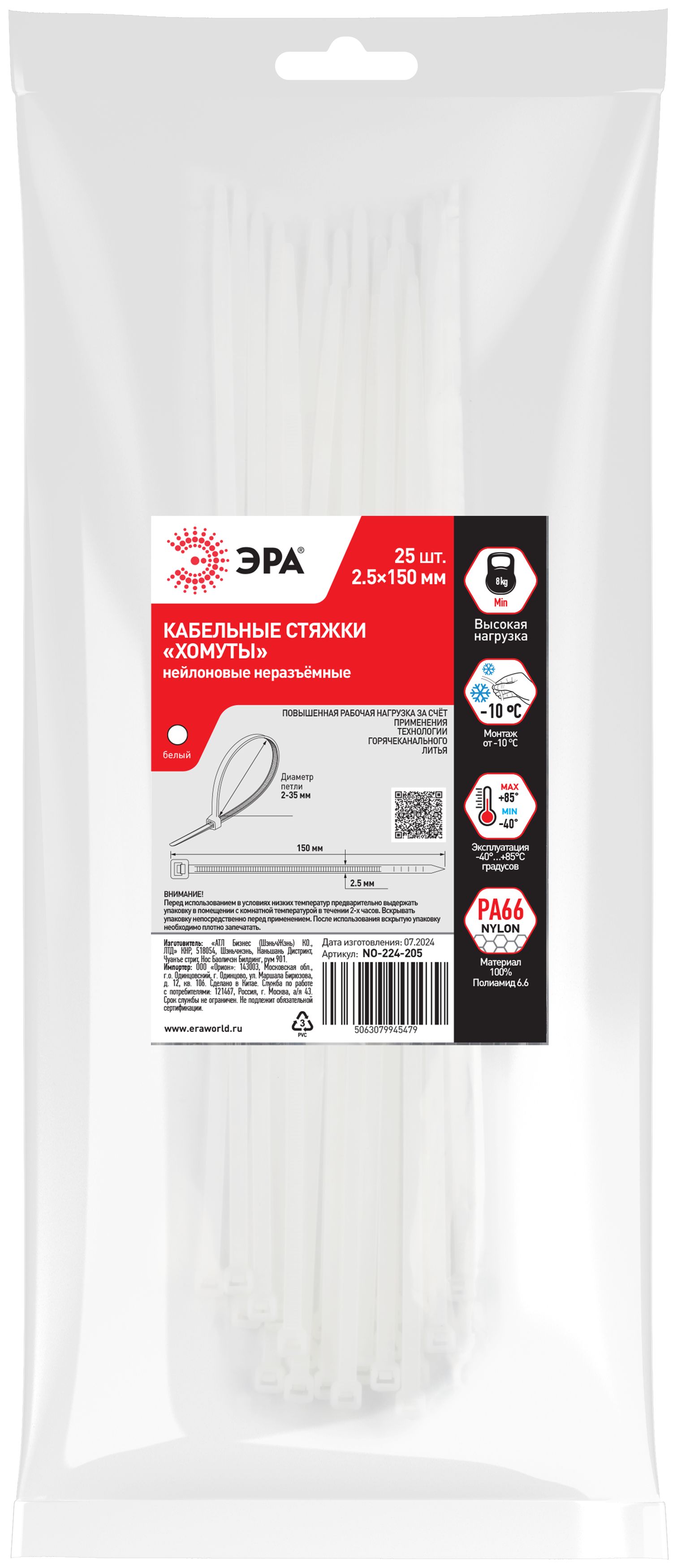 Кабельная стяжка эра no-224-206 (хомут) нейлоновая 2.5 х 200 мм белая (25 шт/уп) б0065994