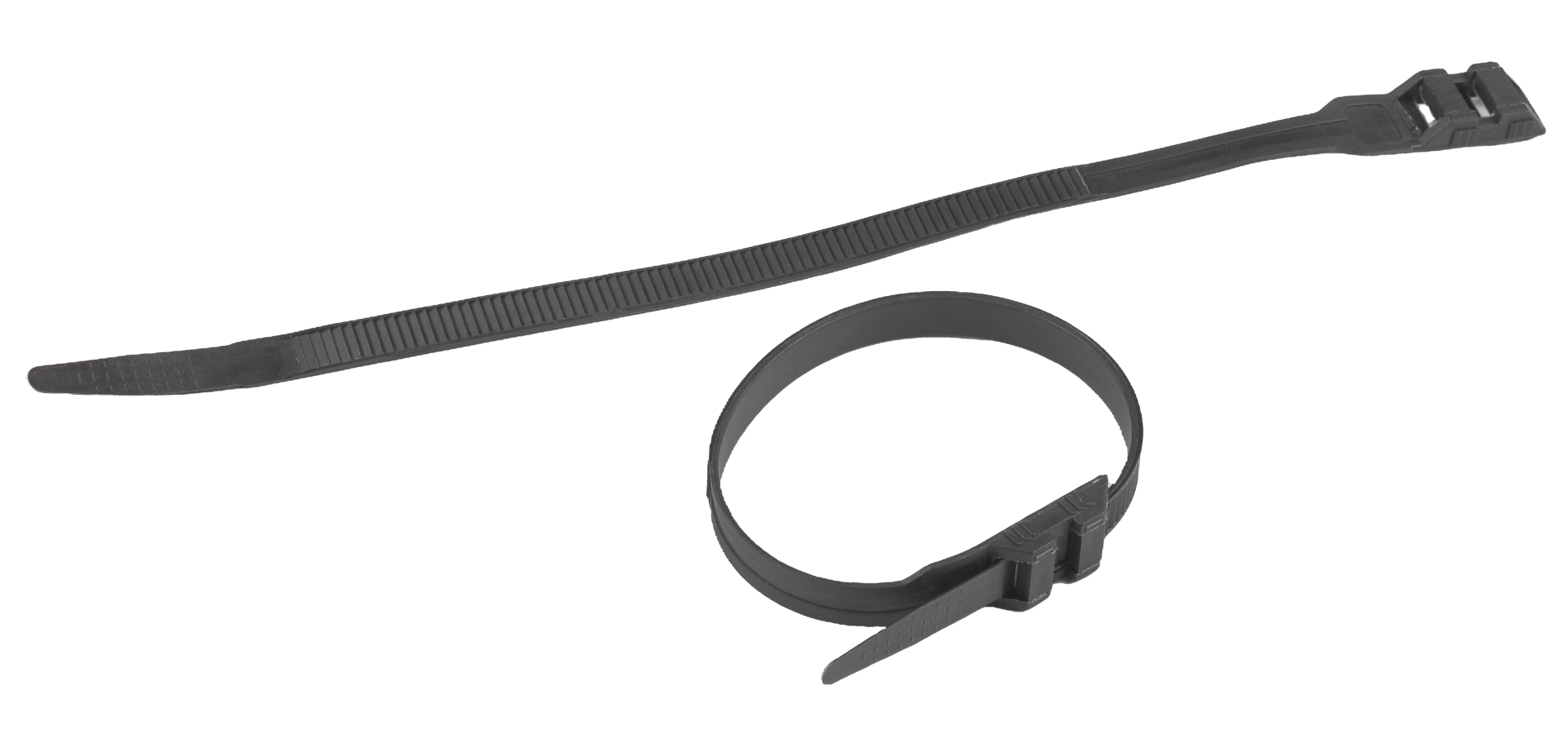 Двойной горизонтальный замок в конструкции хомута обеспечивает надежную фиксацию и экономит пространство. Зубцы в механизме и по всей длине ленты ориентированы в противоположных направлениях, что предотвращает случайное выскальзывание ленты из паза.