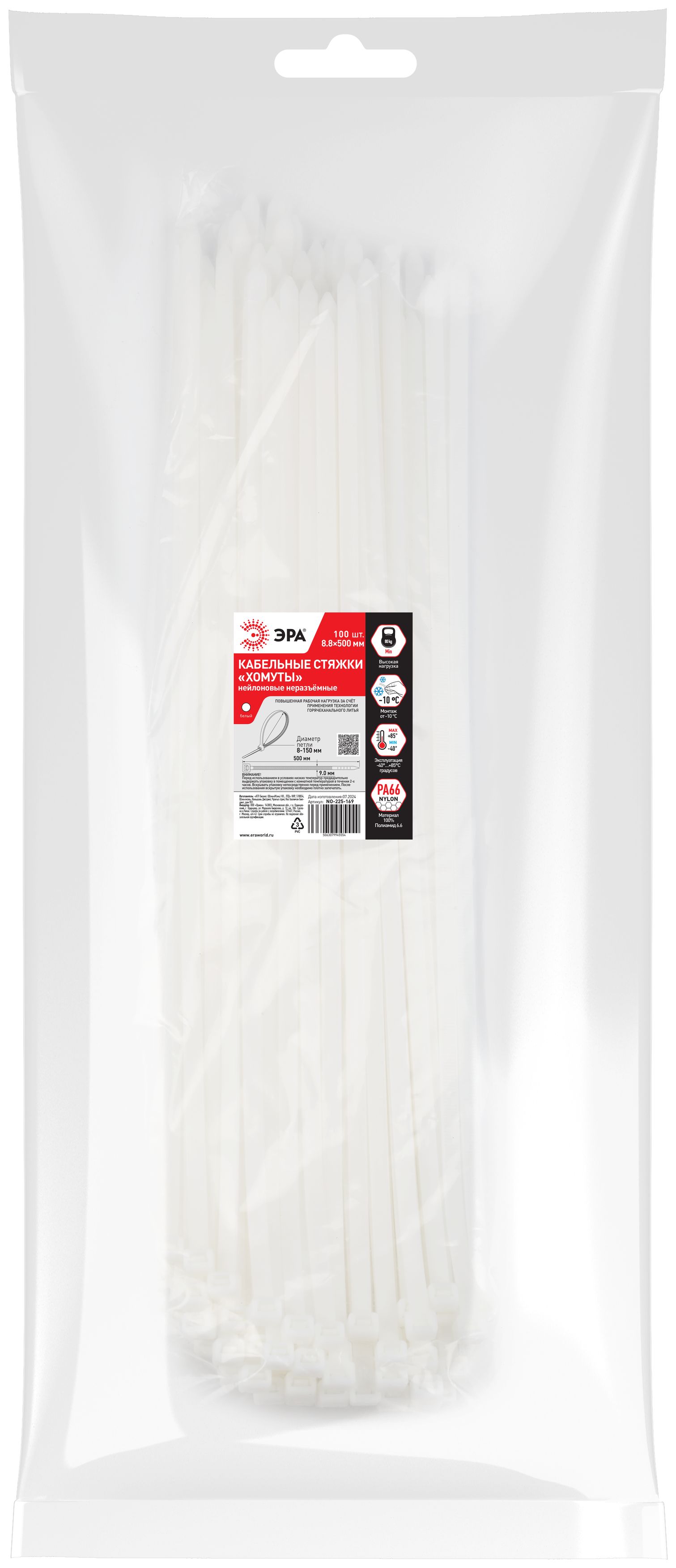 Кабельная стяжка эра no-225-170 (хомут) нейлоновая 8.8 х 750 мм белая (100 шт/уп) б0065961