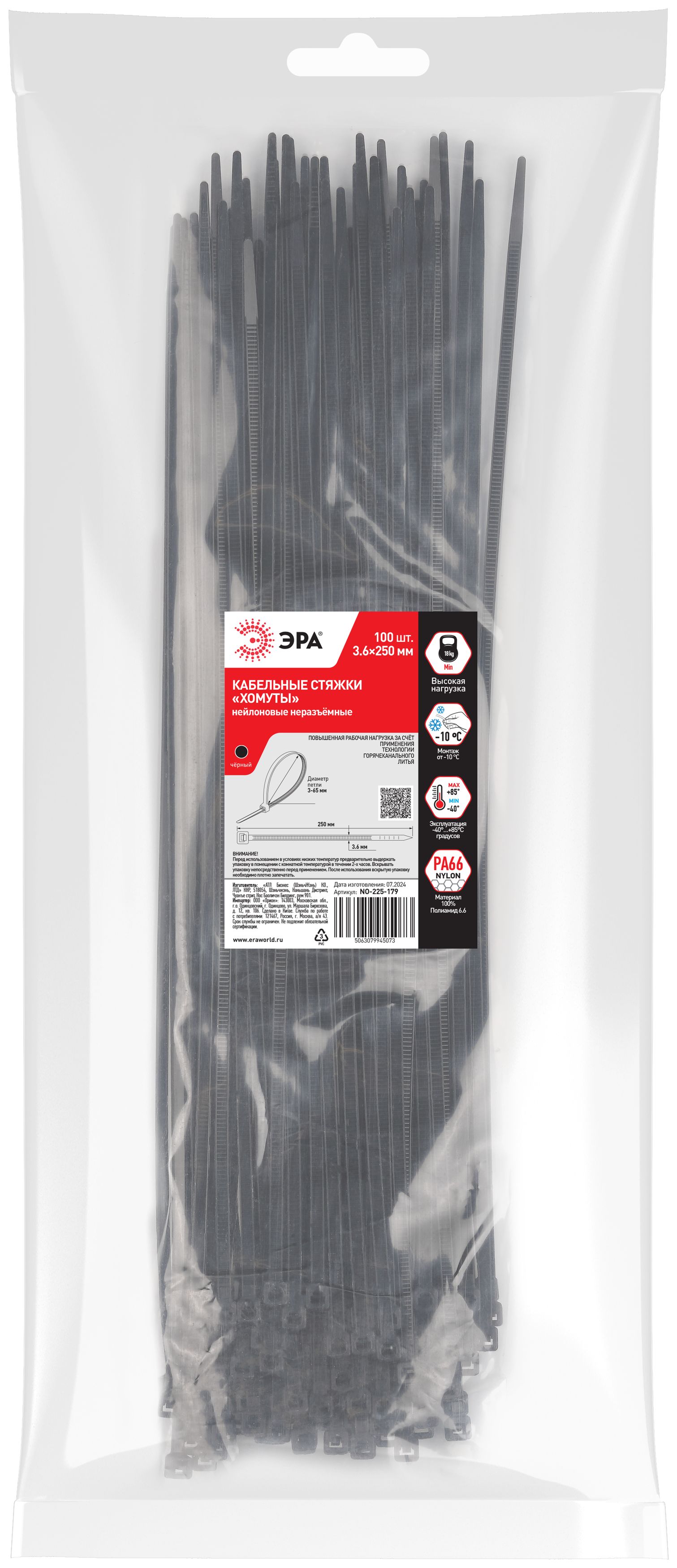 Кабельная стяжка эра no-225-180 (хомут) нейлоновая 3.6 х 300 мм чёрная (100 шт/уп) б0065963