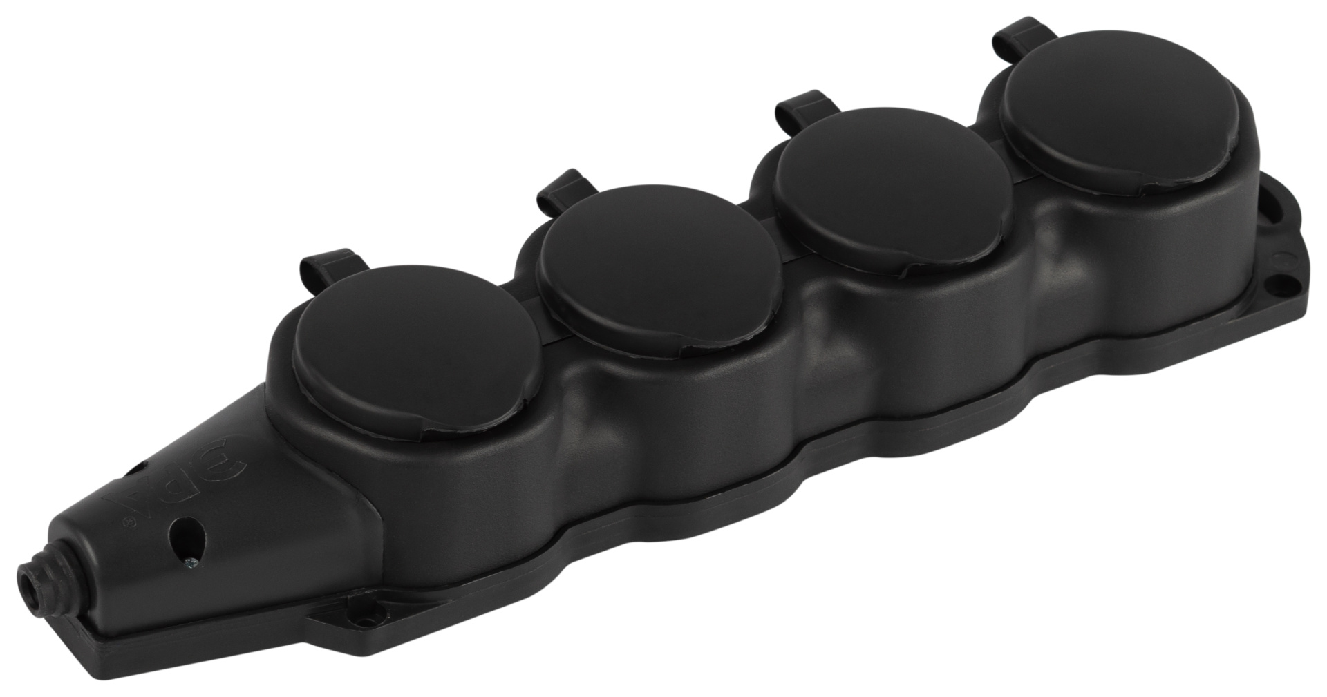 Каучуковая колодка ЭРА KX-4e-B-IP44 4 гнезда, с заземлением, черная, для подключения кабеля (без разбора корпуса). Съёмная крышка. IP44-защита от пыли и влаги. Максимальная мощность 16А/3500Вт. Для кабеля сечением до 3x2,5мм2.