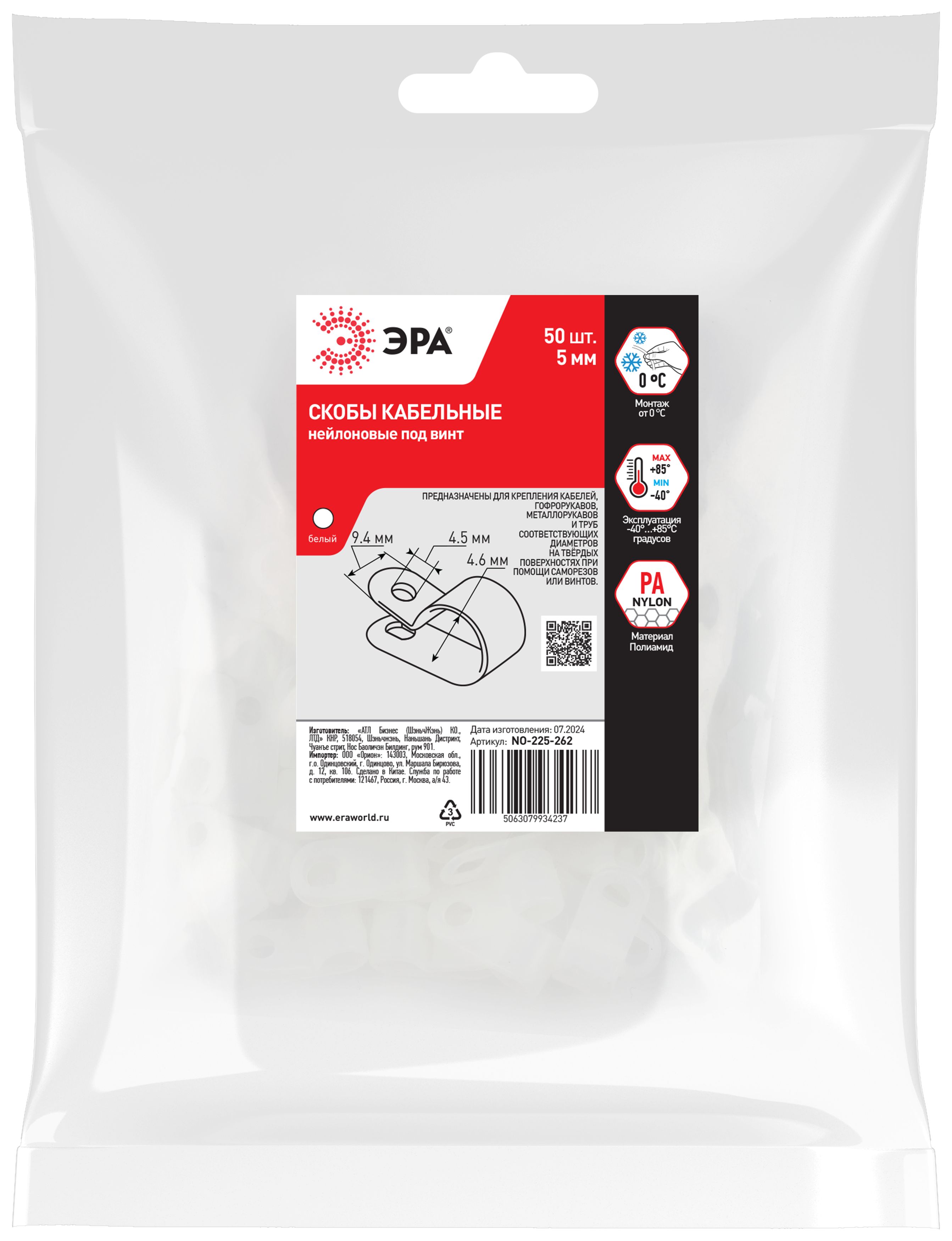 Скобы крепежные нейлоновые под винт ЭРА предназначены для фиксации отдельных кабелей, пучка проводов, гофрорукавов соответствующих диаметров. Это один из наиболее экономичных видов крепежа. Вы самостоятельно можете выбрать наиболее подходящий либо имеющийся у вас в наличии вид крепежа данной скобы к поверхности: саморез, винт с дюбелем и т. п.