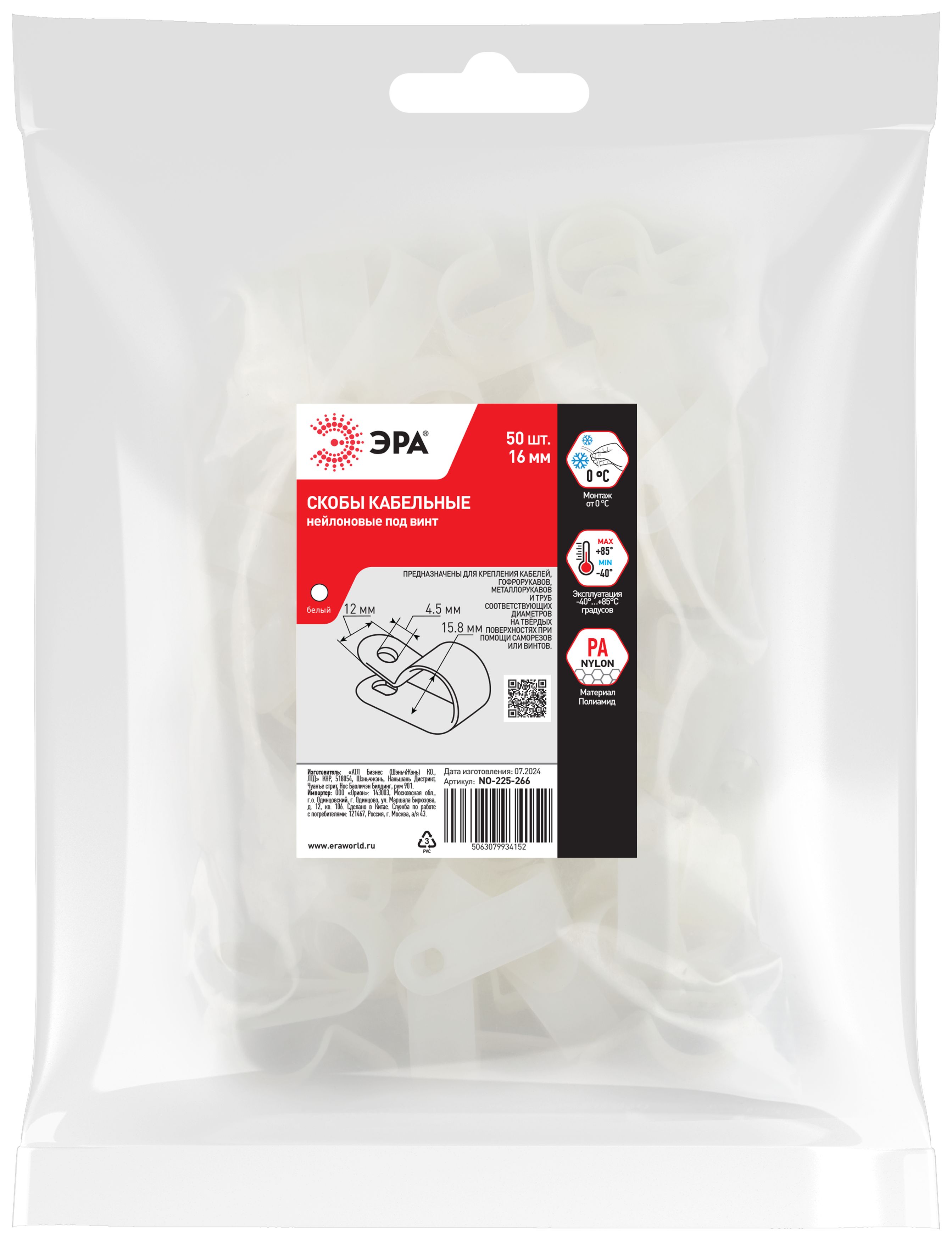 Скобы крепежные нейлоновые под винт ЭРА предназначены для фиксации отдельных кабелей, пучка проводов, гофрорукавов соответствующих диаметров. Это один из наиболее экономичных видов крепежа. Вы самостоятельно можете выбрать наиболее подходящий либо имеющийся у вас в наличии вид крепежа данной скобы к поверхности: саморез, винт с дюбелем и т. п.
