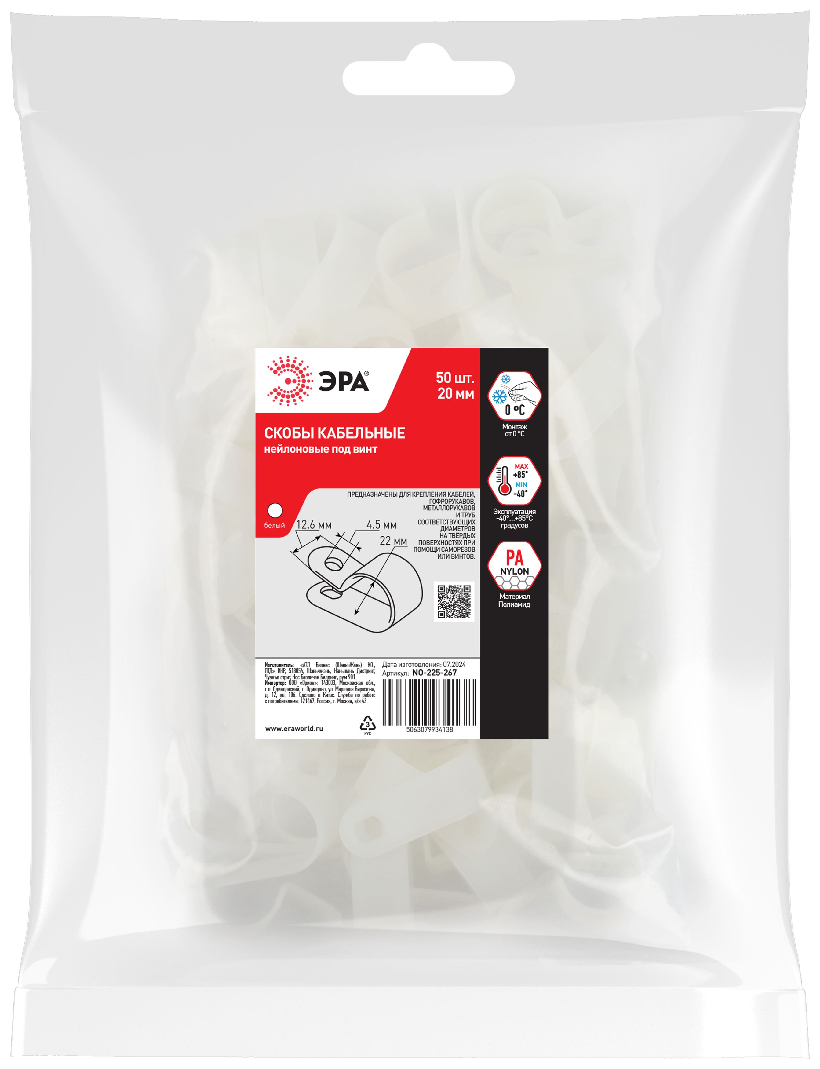 Скобы крепежные нейлоновые под винт ЭРА предназначены для фиксации отдельных кабелей, пучка проводов, гофрорукавов соответствующих диаметров. Это один из наиболее экономичных видов крепежа. Вы самостоятельно можете выбрать наиболее подходящий либо имеющийся у вас в наличии вид крепежа данной скобы к поверхности: саморез, винт с дюбелем и т. п.