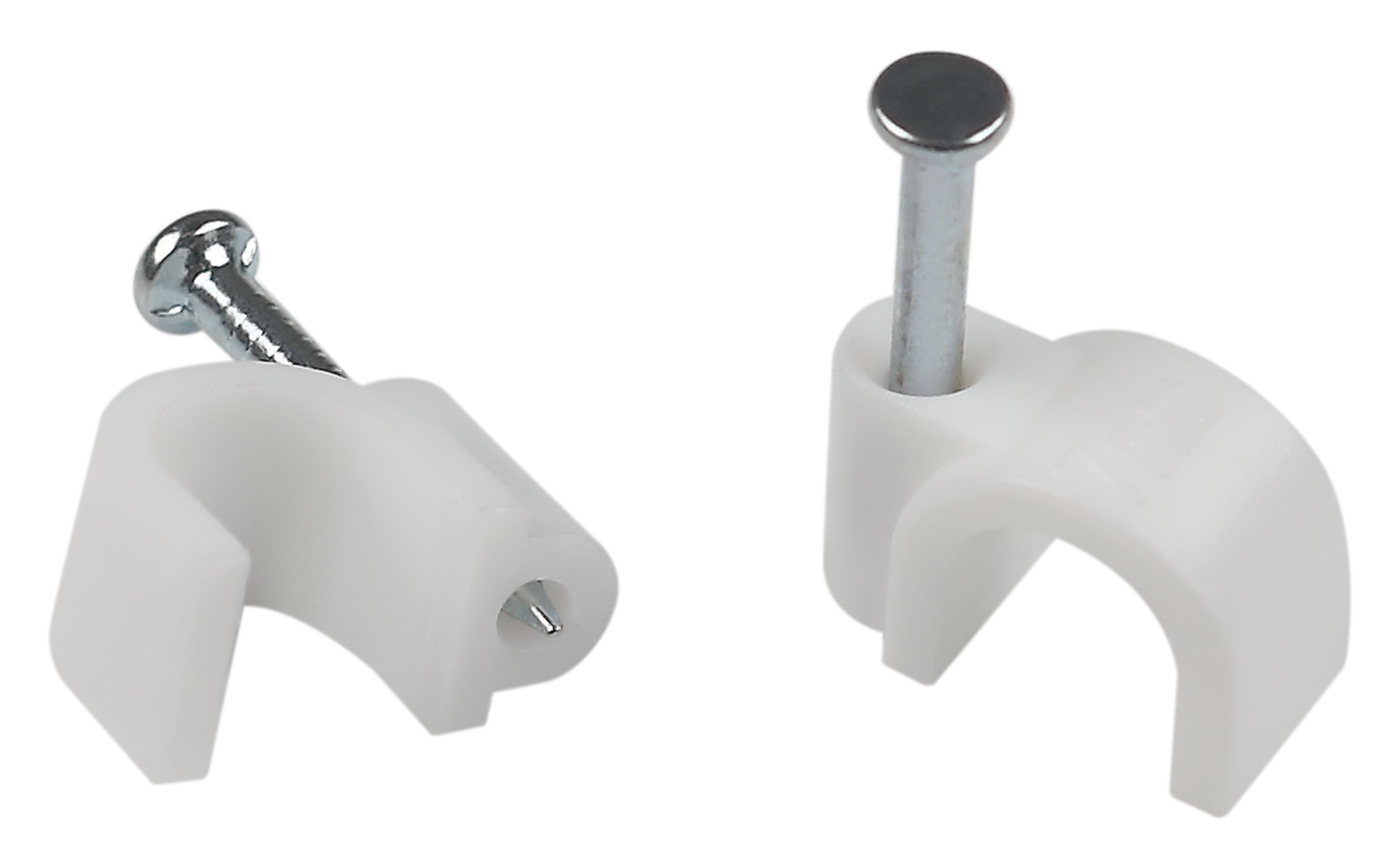В ассортименте 2 типа изделий: для круглого кабеля и для плоского кабеля. Поставляется в комплекте с уже вставленным гвоздем.