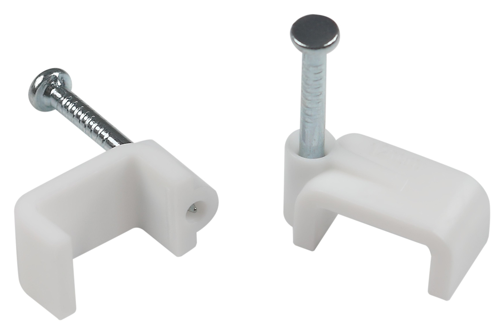 В ассортименте 2 типа изделий: для круглого кабеля и для плоского кабеля. Поставляется в комплекте с уже вставленным гвоздем.