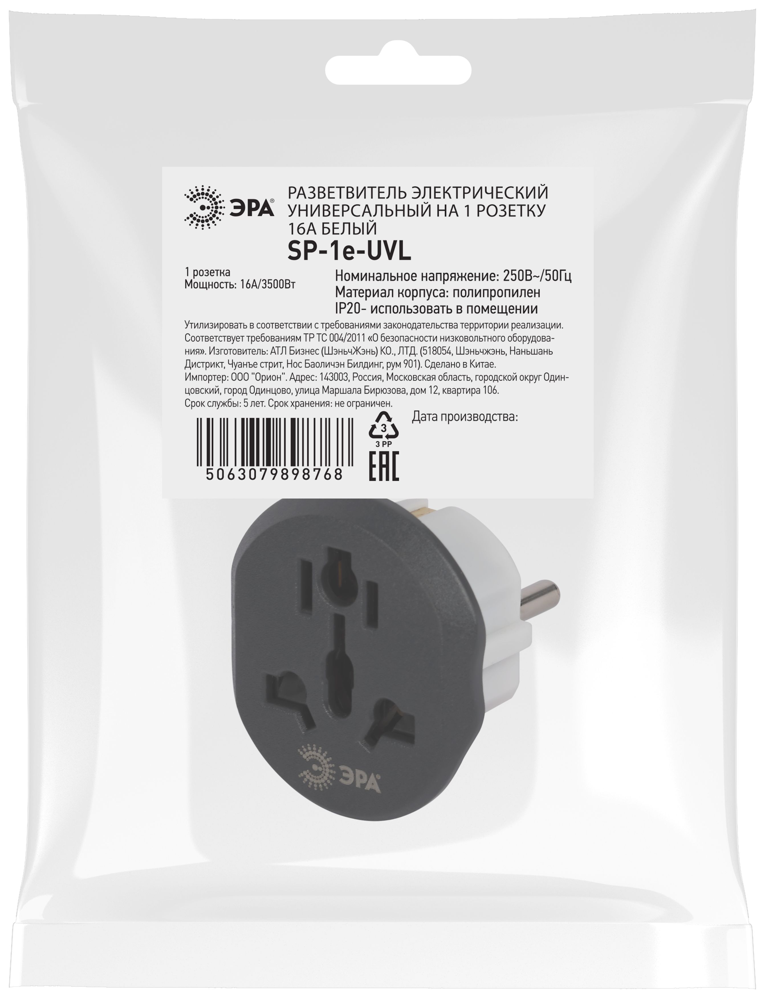 Универсальный сетевой адаптер ЭРА SP-1E-UVL для дома и путешествий. Позволяет подключать бытовую технику с различными типами вилок к стандартной российской розетке 220 В. Совместим с вилками типов: A, В, С, Е, F, G, I. Максимальная нагрузка — 16А / 3500 Вт, что делает адаптер универсальным решением для подключения большинства бытовых устройств: ноутбуков, зарядных устройств, дорожной техники и пр. С заземлением.