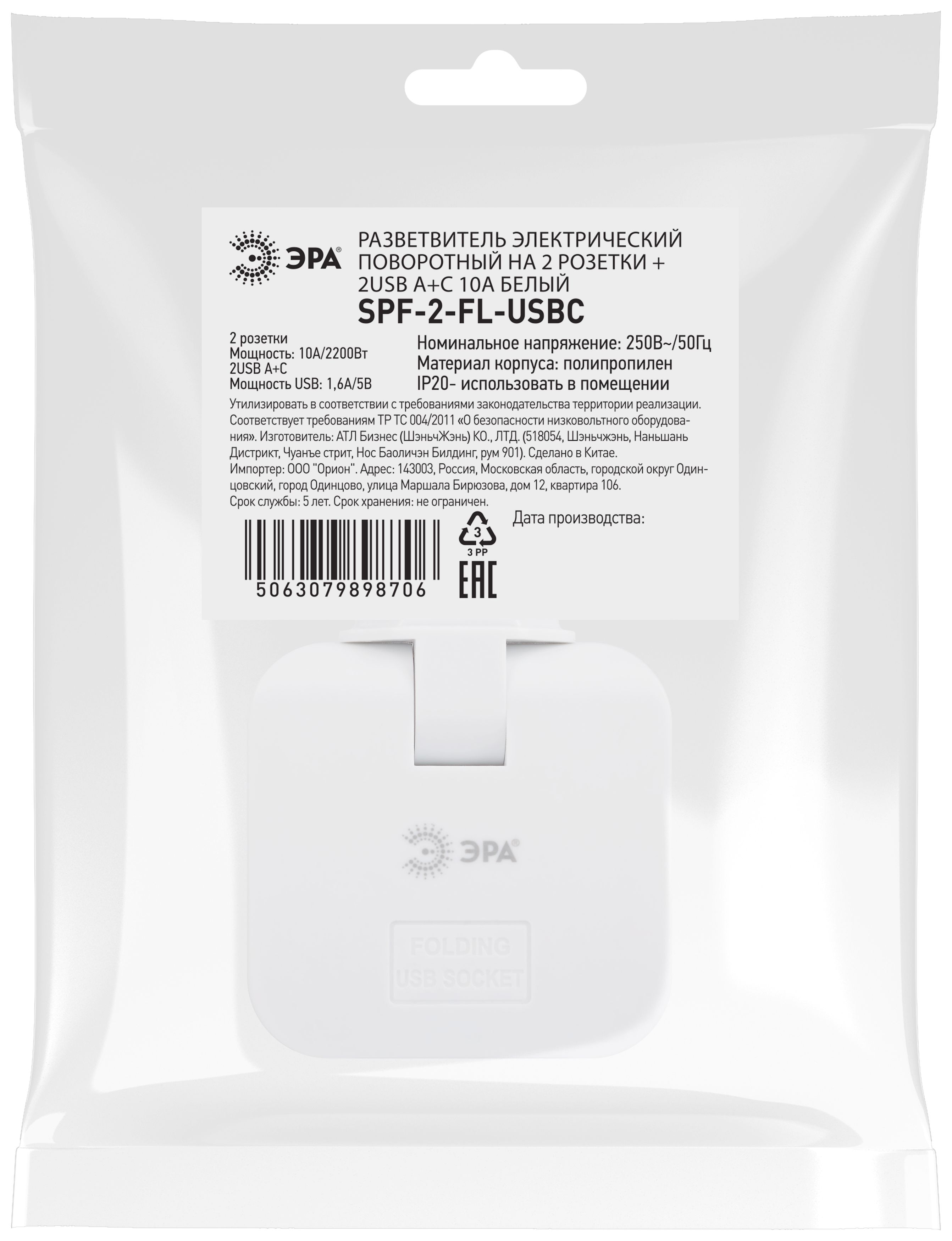 Поворотный разветвитель ЭРА SPF-2-FL-USBC — практичное и функциональное решение для подключения техники. Позволяет подключать несколько электроприборов к одной розетке — 2 розетки для разных типов вилок: А, С, F + 2 USB (A + C). Рассчитан на нагрузку до 10А / 2200 Вт, выполнен в универсальном белом цвете.
