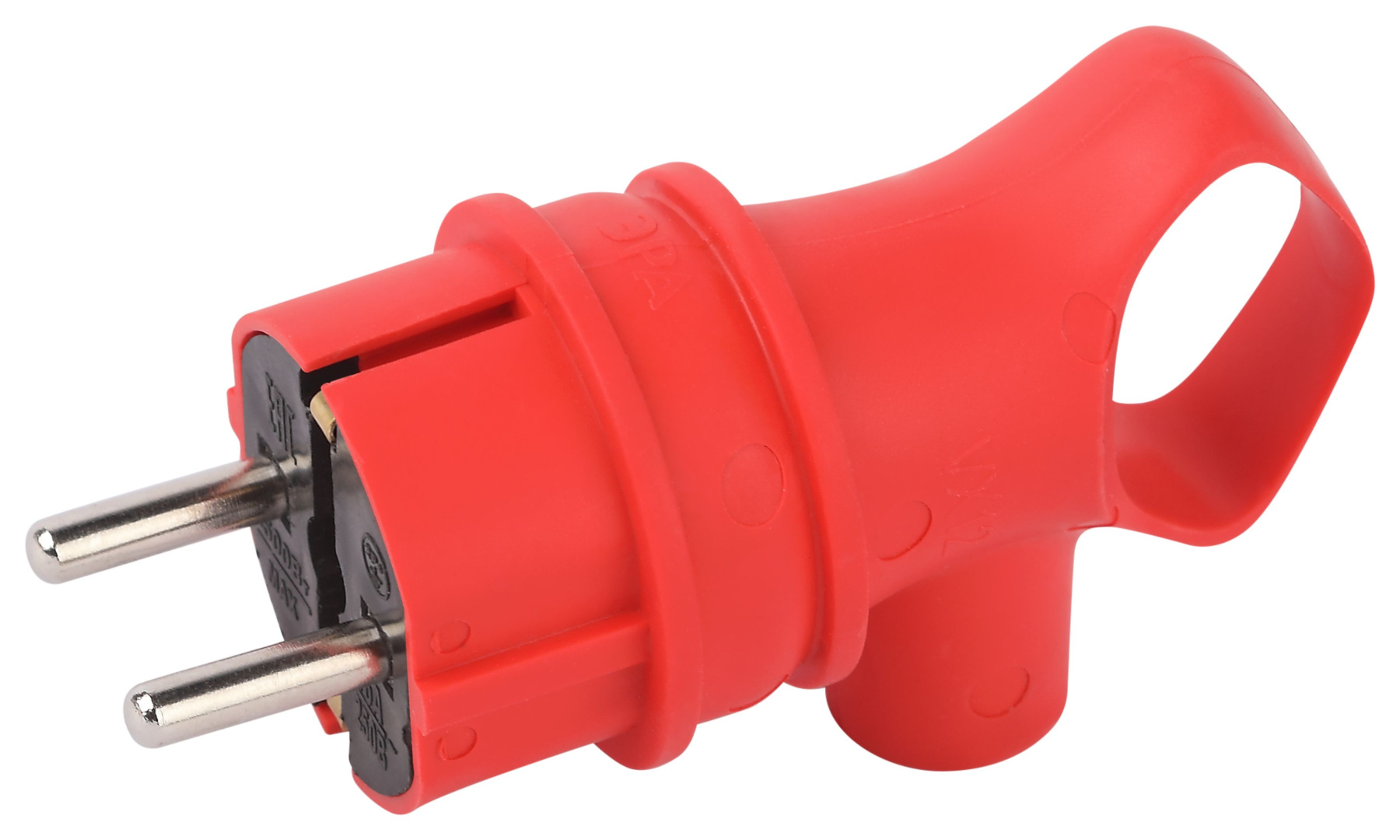 Угловая красная каучуковая вилка с кольцом из серии каучуковых разъёмов ЭРА российского производства. Имеется аналог в чёрном цвете. Рассчитана на нагрузку до 16 А и позволяет подключать кабель КГ сечением до 3x2.5 мм². Вилка с заземлением.