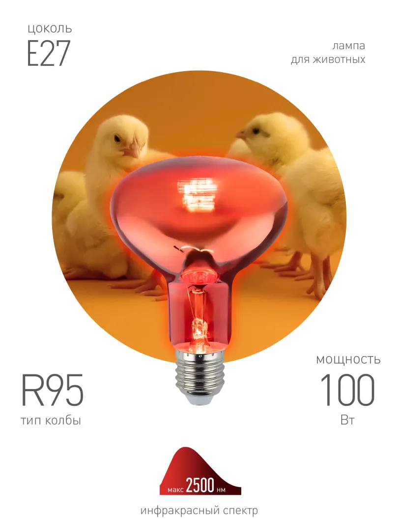 ИКЗК 230-100 R95 E27 ЭРА - ИК-лампа ЭРА для животных с уменьшенной колбой и сниженной t℃ нагрева цоколя. С данной инфракрасной лампой можно использовать стандартные провода без температурной стойкости. Безопасна для сферы животноводства, где для содержания животных применяется дерево, солома, мукомольные изделия и другие легковоспламеняющиеся материалы и корма. Мощность - 100 Вт. Лампа совмещает тепловой и осветительный эффект. Используется только с керамическими цоколями (не с пластиковыми!).