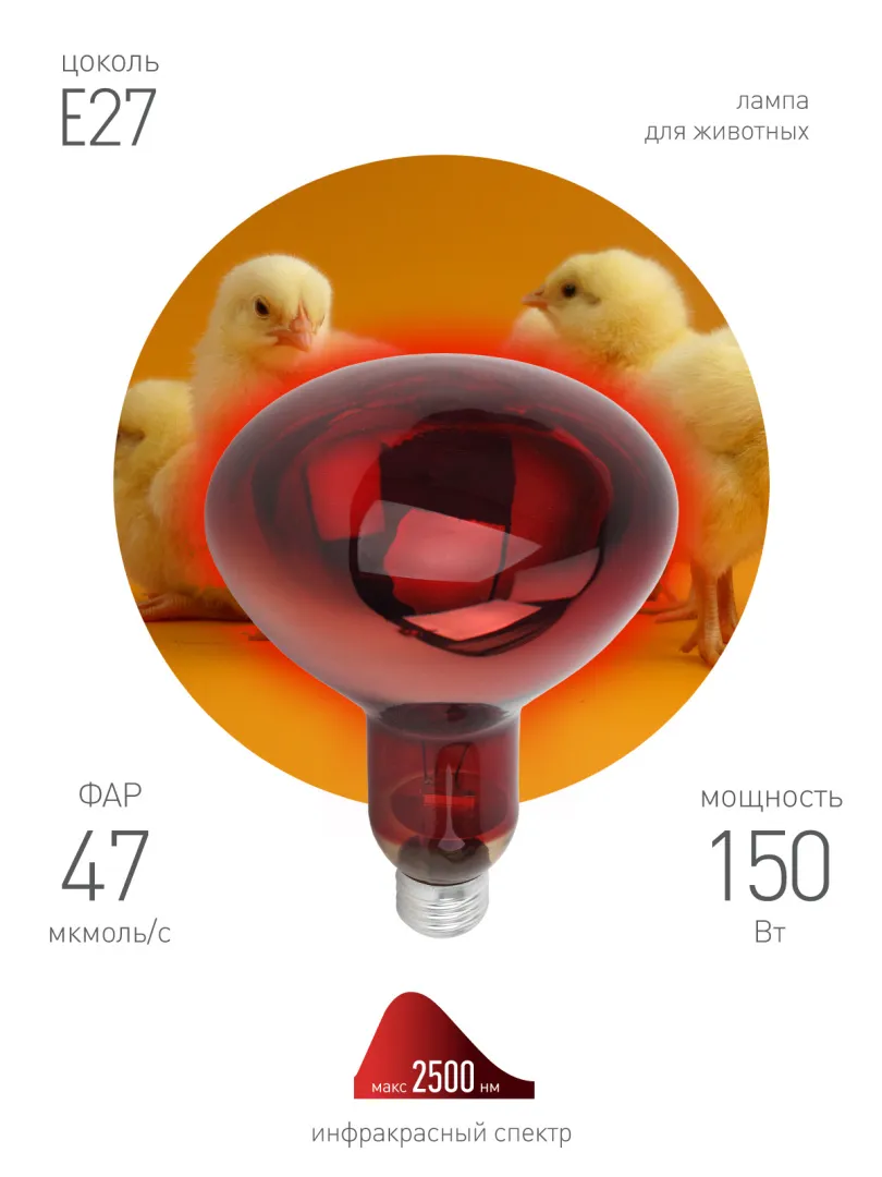 Инфракрасная лампа ЭРА ИКЗК 230-150 R127 для обогрева животных 150 Вт Е27 с красной колбой активно используется в животноводстве, птицеводстве и растениеводстве. Максимальная тепловая мощность без яркого света. Идеальна для стабилизации теплового баланса новорождённых и молодых животных. 100% энергии переходит в тепловую. Работа лампы не зависит от скачков сети, микроимпульсов. Не требуются стабилизаторы напряжения, лампа работает даже при пониженном напряжении. Мгновенно включается и нагревается. Минимум пульсаций освещения. Компактные размеры.