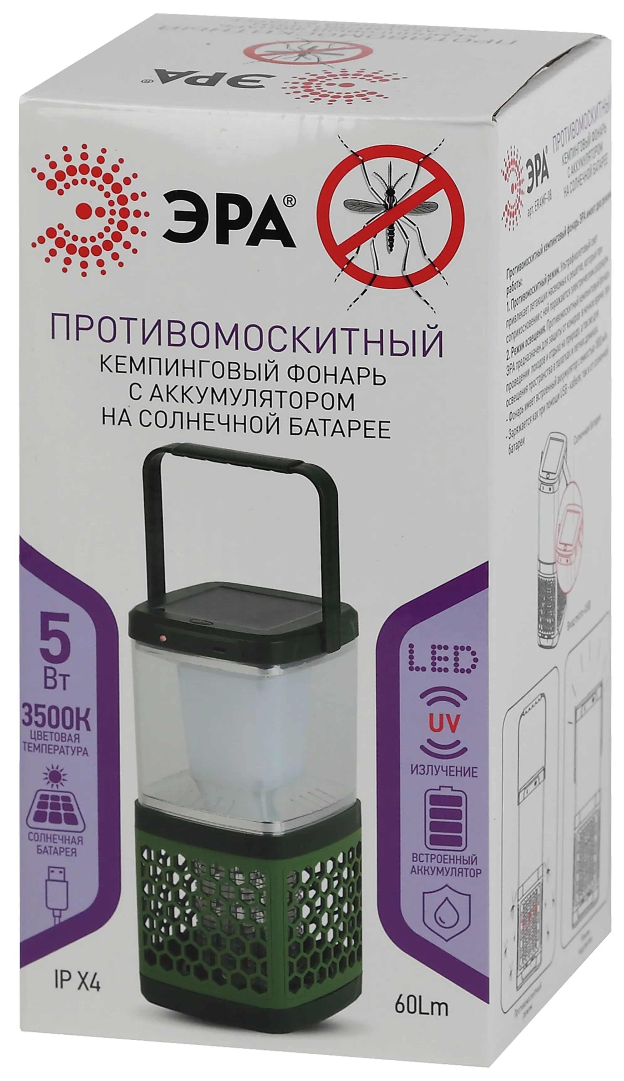 Противомоскитный кемпинговый фонарь ЭРА ERAMF-08 станет излюбленным аксессуаром любителей летних походов. Его отличительная особенность состоит в том, что лампа от комаров может использоваться как светильник. В режиме освещения антимоскитный фонарь уничтожает насекомых, привлекая их ультрафиолетовым излучением с последующим воздействием на них легкого напряжения. При этом лампа от насекомых совершенно безопасна для человека. Антимоскитная лампа прекрасно освещает дачные домики, палатки, создавая уютную атмосферу летнего отдыха. Лампа против насекомых может работать от USB-кабеля или от встроенной солнечной батареи. Цветовая температура фонаря составляет 3500 К. Удобный и практичный антимоскитный кемпинговый фонарь станет незаменимым помощником на природе и даче.