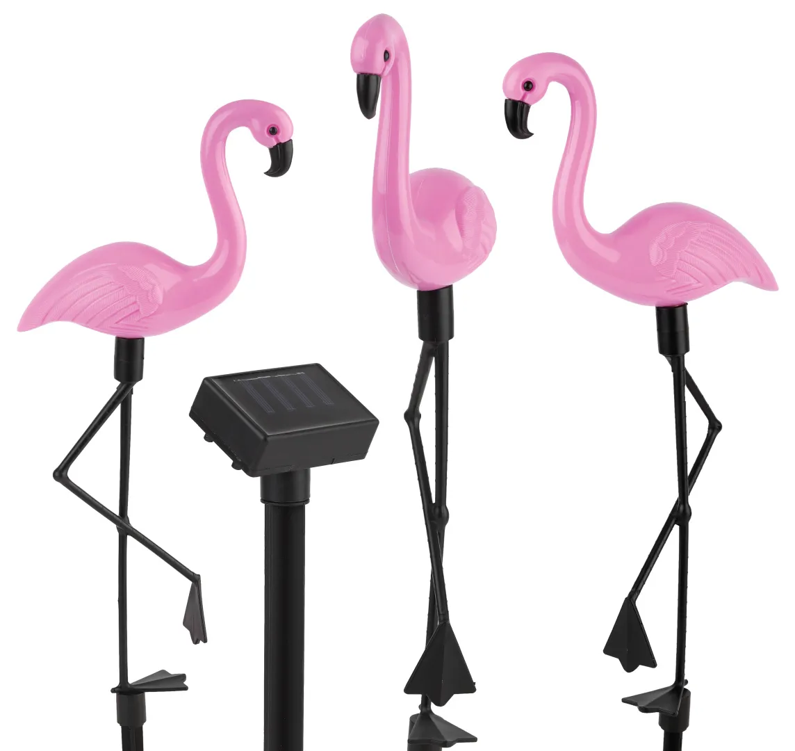 Беспроводной led светильник ERADF008-06 "Фламинго" станет чудесным украшением вашего сада. Удобная конструкция и упрощенная сборка позволят Вам разместить подсветку около клумбы, украсить пруд, территорию рядом с бассейном, необычно подсветить тропинку или вход в террасу. 3 пластиковые фигурки высотой 52,5 см крепятся на штекер и с легкостью втыкаются в землю.