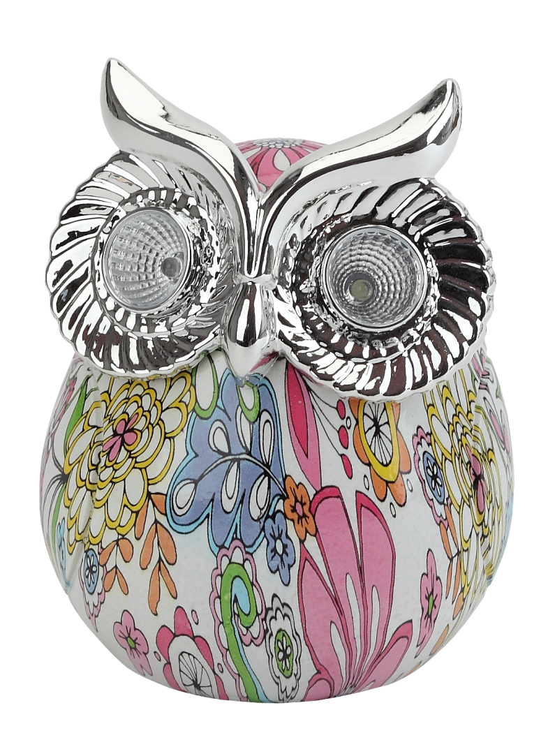Садовый светильник на солнечной батарее ERAFYS01-03 "Сова" станет необычным персонажем на Вашей дачной территории. Небольшие внешние габариты позволят Вам разместить светодиодную подсветку в саду, украсить пруд, изящно подсветить кустарники или вход в террасу. Фигурка из искусственного камня высотой 15 см с легкостью устанавливается в землю. Светильник функционирует на солнечной батарее. Такой тип получения энергии является максимально экологичным, энергоемким, а также бесшумным. Питание происходит во включенном режиме, днем. После захода солнца пузатая сова "просыпается". Ее огромные глаза сияют белым заливным светом, создавая атмосферу сказки, волшебства. Забавный дизайн в цветочек на корпусе посеет радость и веселье среди жильцов участка, органично впишется в растительность. Сова сможет радовать Вас непрерывно в течение 8 часов. Высокая степень защиты от пыли и влаги позволяет оставлять светильник на улице даже во время дождя. Обращаем Ваше внимание, что перед использованием фигурки её необходимо включить и зарядить. Светильник заряжается в течение всего светового дня. Декоративный светильник ERAFYS01-03 "Сова" от бренда ЭРА маленький мудрый обитатель Вашего сада!