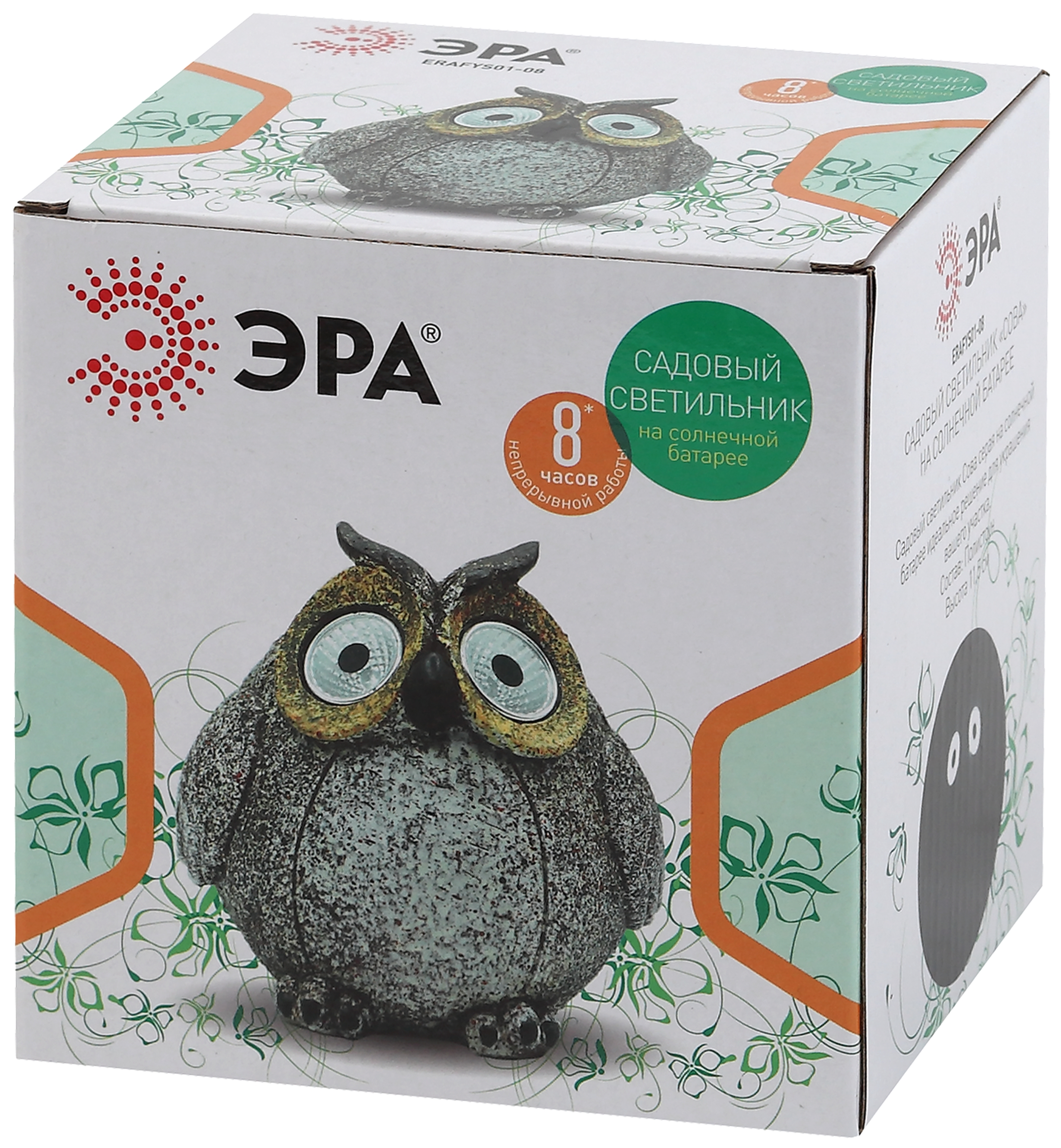 Садовый светильник на солнечной батарее ERAFYS01-08 "Сова" станет прекрасным украшением вашего сада. Небольшие размеры позволят Вам разместить дачную подсветку в палисаднике, украсить пруд, веранду, изящно подсветить аллею или вход в дом. Фигурка из полистоуна высотой 11,5 см с легкостью устанавливается в землю. Садовый светильник функционирует на солнечной батарее. Такой тип получения энергии является наиболее экологичным, энергоемким, а также бесшумным. Питание происходит во включенном режиме, в светлое время суток. После захода солнца маленькая сова "просыпается". Территория вокруг нее освещается холодным белым светом, исходящим из глаз. Создается настоящая атмосфера волшебства. Необычный стиль корпуса придает фигурке причудливый стиль. Солнечная батарея предусматривает 8 часов непрерывной работы. Высокая степень защиты от пыли и влаги позволяет оставлять садовый светильник на улице даже во время дождя. Обращаем Ваше внимание, что перед использованием фигурки её необходимо включить и зарядить. Светильник заряжается в течение всего светового дня. Подсветка на солнечной батарее ERAFYS01-08 "Сова" от компании ЭРА лучший вариант для преображения Вашей дачной территории.