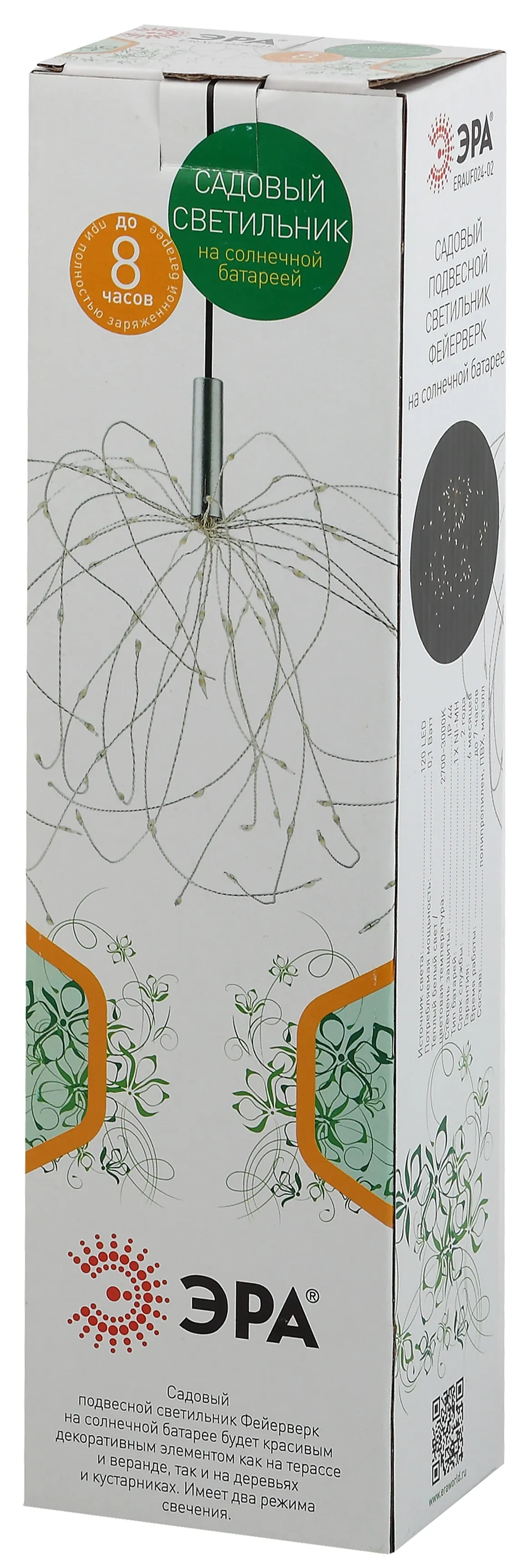 Беспроводной подвесной светильник ERAUF024-02 "Фейерверк" говорит сам за себя! Он сделает яркий акцент на садовом освещении Вашего участка. Небольшие внешние размеры позволят Вам расположить светильник на карнизе, украсить деревья, придомовую территорию и фасад. Конструкция из пластика легко подвешивается с помощью специального крепления. Садово-парковый светильник функционирует на солнечной батарее. Такой способ получения энергии является наиболее экологичным, энергоемким, а также бесшумным. Питание происходит во включенном режиме, в дневное время. С наступлением темного времени суток крохотные LED диоды, разбросанные по проволочкам, загораются желтым светом. Территория вокруг светильника сразу приобретает праздничный характер. Необычный хаотичный дизайн конструкции напоминает салют. Солнечная батарея рассчитана на 8 часов непрерывной работы. Высокая степень защиты от пыли и влаги позволяет оставлять светильник в саду во время дождя. Обращаем Ваше внимание, что перед использованием фигурки её необходимо включить и зарядить. Светильник заряжается в течение всего светового дня. Подвесной садовый светильник фейерверк от компании ЭРА нестандартное решение для украшения дачи.