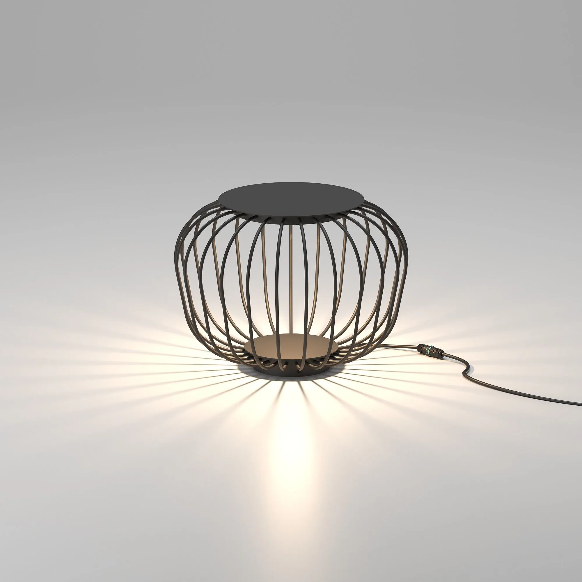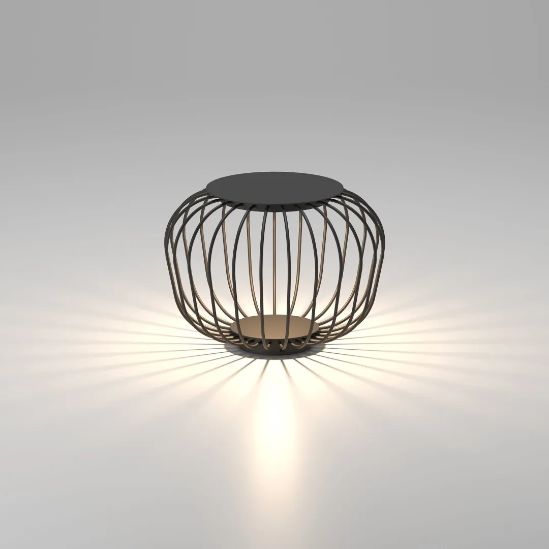 Светодиодный источник света с мощностью 10 Вт расположен под крышкой, что обеспечивает рассеянный световой поток. Структура стальных стержней, организованных по кругу, помогает создавать эффект света и тени на поверхности.