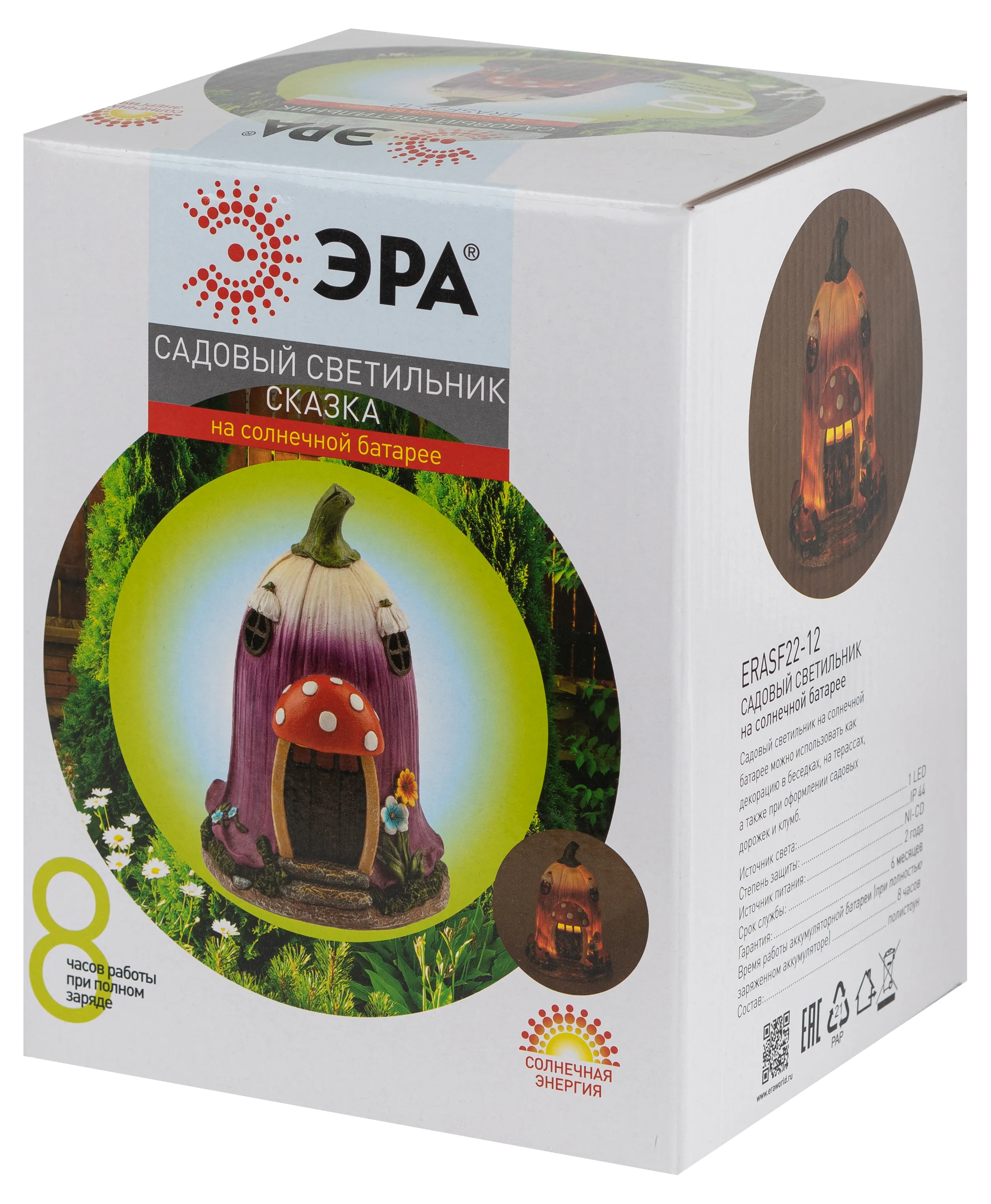 Фигурка садовая "Сказка" от бренда ЭРА станет очаровательным декором Вашего садового участка! Этот уличный светодиодный светильник, напоминающий жилище гномика, преобразит территорию у дома - можно украсить им клумбу, альпийскую горку, подсветить тропинку или террасу дачи. Миниатюрный фонарь ERASF22-12 высотой 19 см выполнен из полистоуна и тщательно детализирован. Беспроводной садовый светильник работает на солнечной батарее, этот тип получения энергии является самым экологичным, энергоемким, а также бесшумным. Питание происходит во включенном режиме в солнечную погоду, фигурка сама загорается с наступлением ночи и работает до 8 часов. Сказочный домик с теплым светом наполнит Ваш сад уютом и таинственностью!