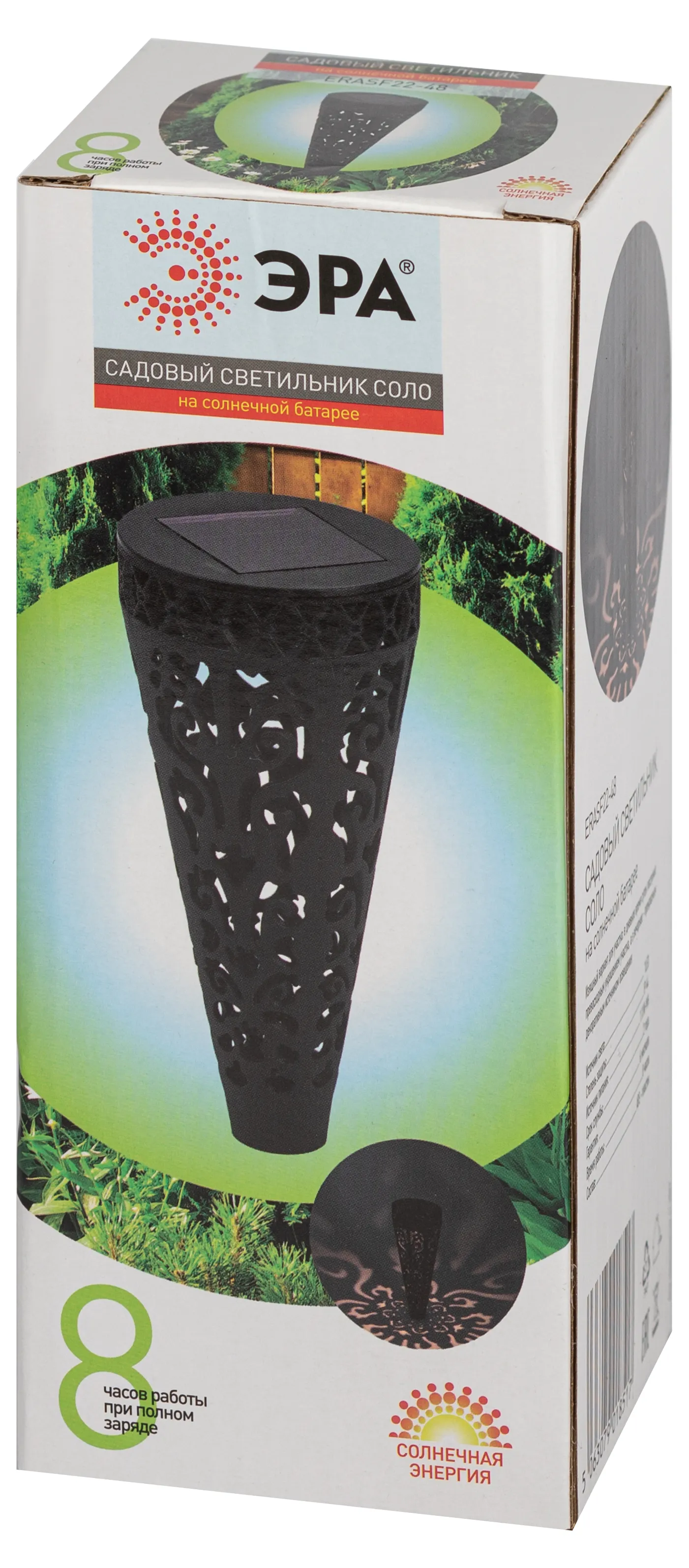 Высота ажурного садового светильника ЭРА ERASF22-48 (арт. Б0057659) на солнечной батарее - 29 см. Уличный светильник быстро и легко втыкается в грунт благодаря заострённому колышку, поставляемому в комплекте. Встроенная солнечная батарея аккумулирует солнечную энергию в течение всего светового дня (даже в пасмурную погоду!), чтобы с наступлением сумерек светильник уличный садовый автоматически включился и начал радовать жильцов и гостей загородного участка своим красивым тёплым светом с ажурным световым рисунком. Дизайн в виде факела со световыми узорчатыми проекциями на окружающее пространство привлекает внимание и запоминается. Тёплый свет создаёт уютную атмосферу для вечернего отдыха.