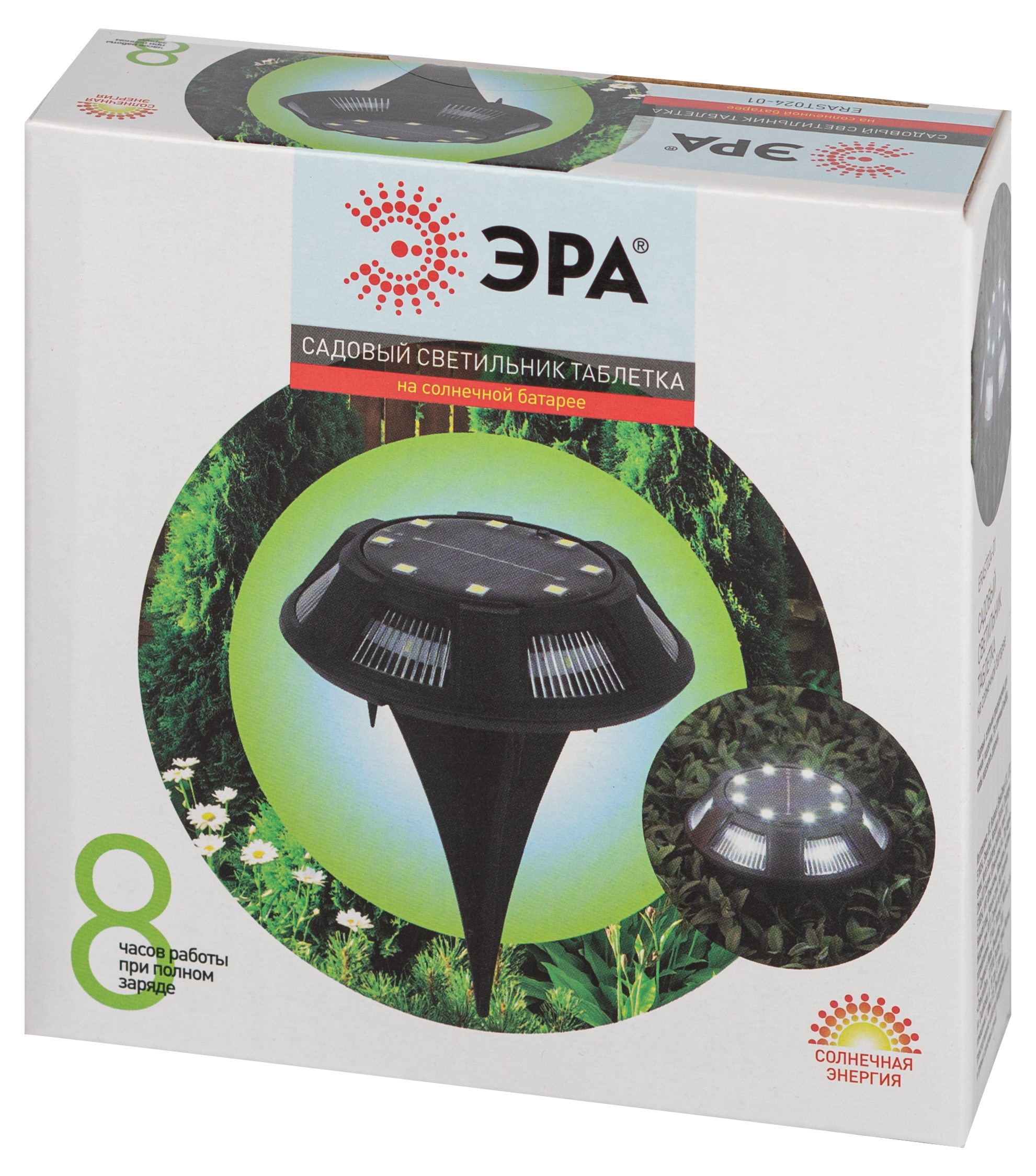 ЭРА ERAST024-01 "Таблетка" (арт. Б0057662) - небольшой грунтовый светильник садовый диаметром 11,5 см. Для быстрой и лёгкой установки предусмотрена заострённая ножка. Солнечная батарея встроена прямо в корпус. Миниатюрная грунтовая подсветка из стали и прочнейшего пластика долговечна и эстетична. Светильник уличный ЭРА "Таблетка" устойчив к механическим повреждениям, с его помощью можно смело подсвечивать садовые дорожки, на него можно наступать. От одного полного заряда в течение светового дня этот влагозащищённый садовый светильник работает до 8 часов. Оформленные светом LED-таблеток ЭРА дорожки, клумбы, альпийские горки, террасы, грядки, газоны выглядят стильно и современно.