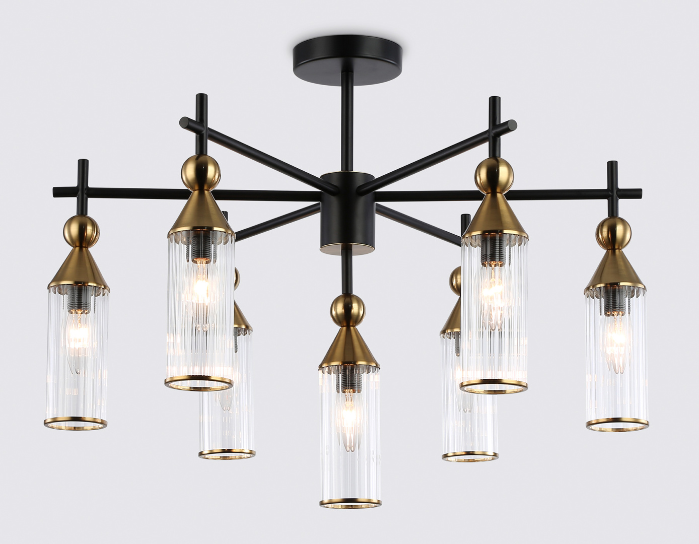 Люстра на штанге из коллекции HIGH LIGHT. Модель LH55257 представлена в стиле модерн. Люстра выполнена из стеклянных прозрачных плафонов, металлического каркаса черного цвета и цвета латунь. Для данной модели подойдут лампы с цоколем Е14. Люстра будет прекрасным дополнением в любом помещении.