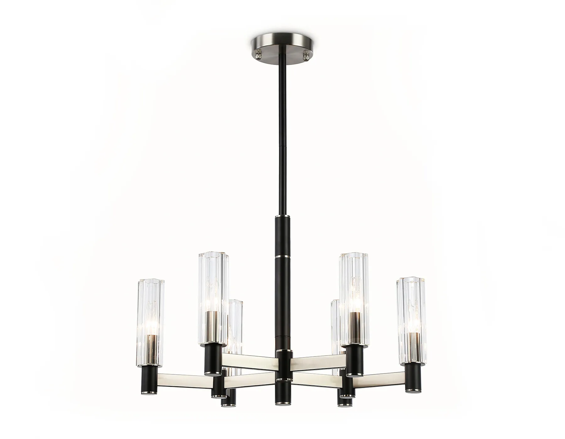 Люстра на штанге из коллекции HIGH LIGHT. Модель LH55501 представлена в стиле модерн. Люстра выполнена из стеклянных прозрачных плафонов и металлического каркаса черного цвета, цвета сатин никель. Для данной модели подойдут лампы с цоколем Е14. Люстра будет прекрасным дополнением в любом помещении.
