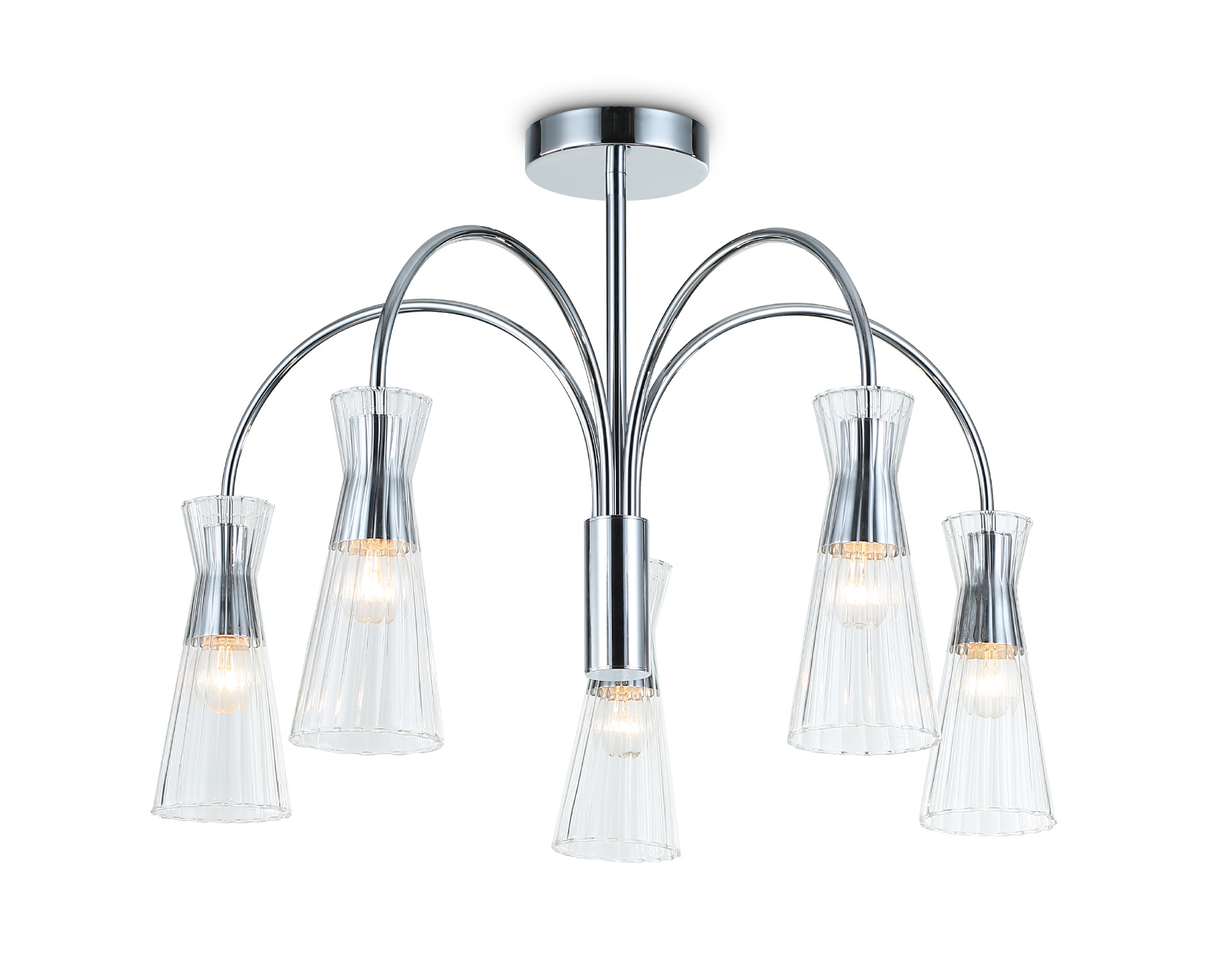 Подвесная люстра на штанге из коллекции HIGH LIGHT. Модель LH55651 представлена в стиле модерн. Люстра выполнена из металлического каркаса цвета хром и стеклянных прозрачных плафонов. Имеет пять цоколей Е14. Люстра будет прекрасным дополнением в любом помещении.