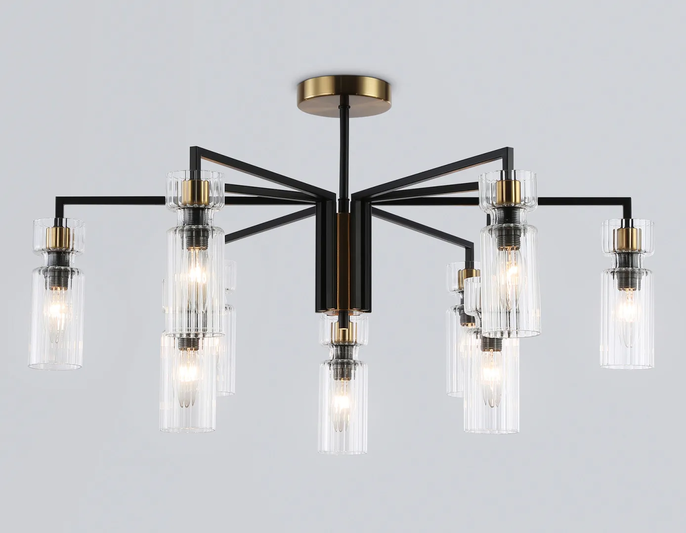 Люстра на штанге из коллекции HIGH LIGHT. Модель LH56117 представлена в стиле модерн. Люстра выполнена из стеклянных прозрачных плафонов и металлического каркаса черного цвета и цвета латунь. Для данной модели подойдут лампы с цоколем Е14. Люстра будет прекрасным дополнением в любом помещении.