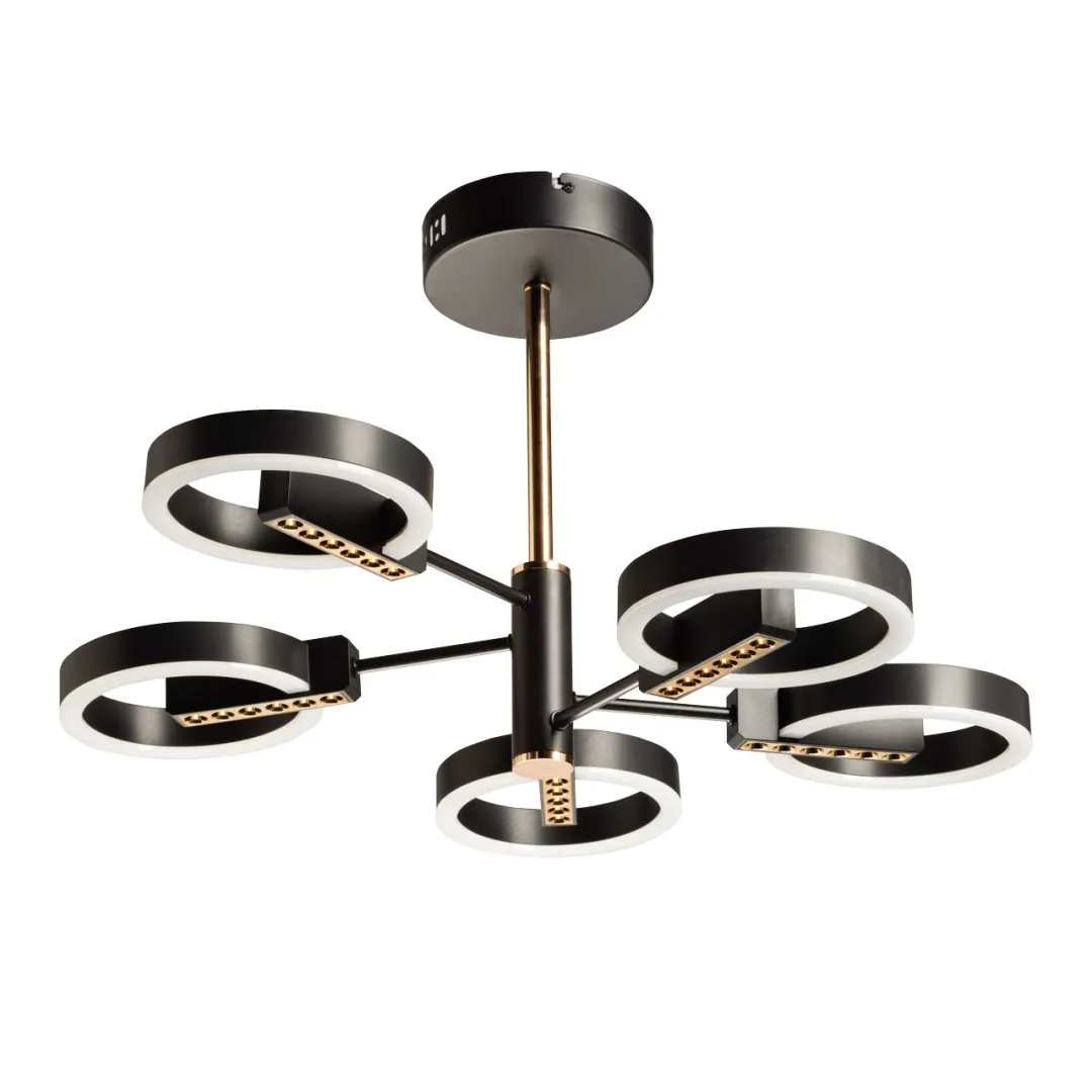 Металлическое основание подвесной люстры окрашено в черный цвет. Отдельные элементы основания гальванизированы в цвет золота. Корпус плафонов выполнен из сплава алюминия и окрашен в цвет основания. Светодиодные источники декоративного света закрыты матовым акрилом. Открытые функциональные точечные светодиоды углублены в корпус плафонов.