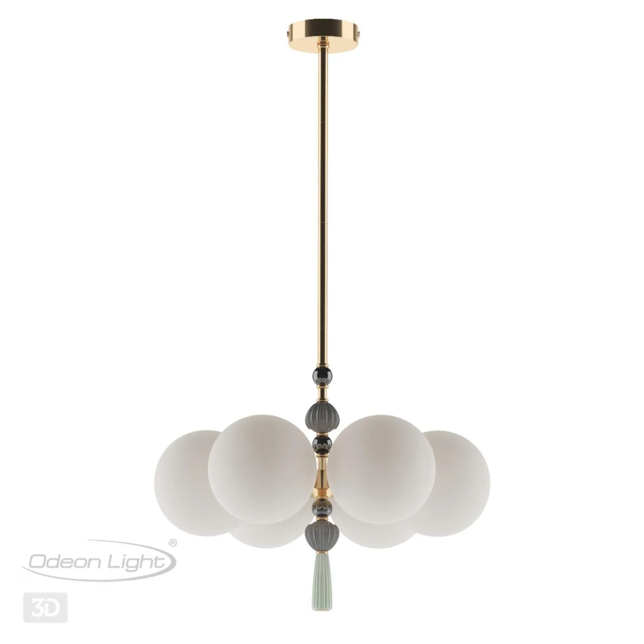 Воздушная линия светильников Palle декорирована керамикой ручной работы.  В ней  красиво сочетаются гофрированная керамика, металл покрытый золотой гальваникой и матовое белое стекло. Керамический декор выполнен в серых оттенках  с акцентной светло-зеленой кисточкой и дополнен стеклянными черными бусинами. Потолочные светильники имеют возможность регулировки высоты благодаря наборной штанге.