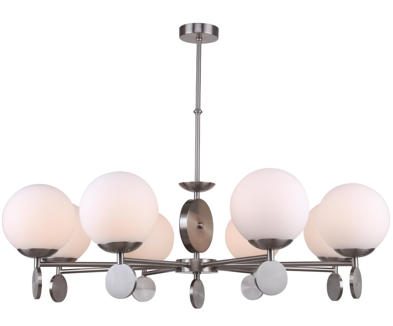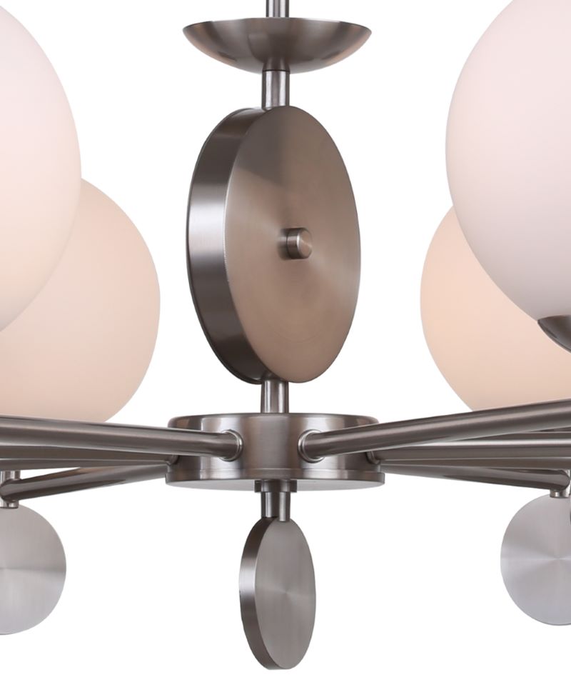Люстра на штанге из коллекции Marsela выполнена из металла, гальванизированного в цвет никеля и декорирована белыми стеклянными матовыми плафонами, а также металлическими медальонами, гальванизированными в цвет арматуры. Премиальное качество и неповторимыи? дизаи?н светильников идеально подои?дут как в классические, так и современные интерьеры.
