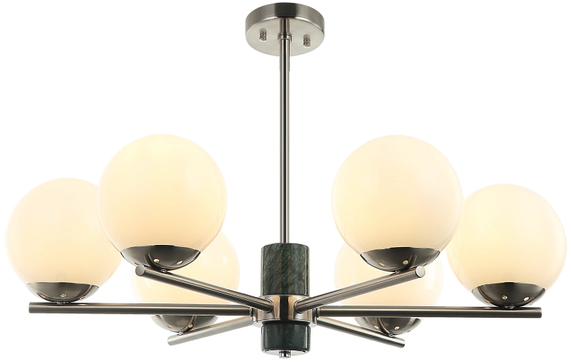 Люстра на штанге из коллекции Sharo выполнена из металла, гальванизированного в цвет никеля, и декорирована натуральным мрамором. Источники света закрыты белыми глянцевыми плафонами. Премиальное качество и неповторимыи? дизаи?н светильников идеально подои?дут как в классические, так и современные дизайнерские интерьеры.