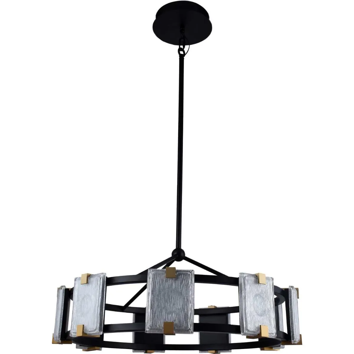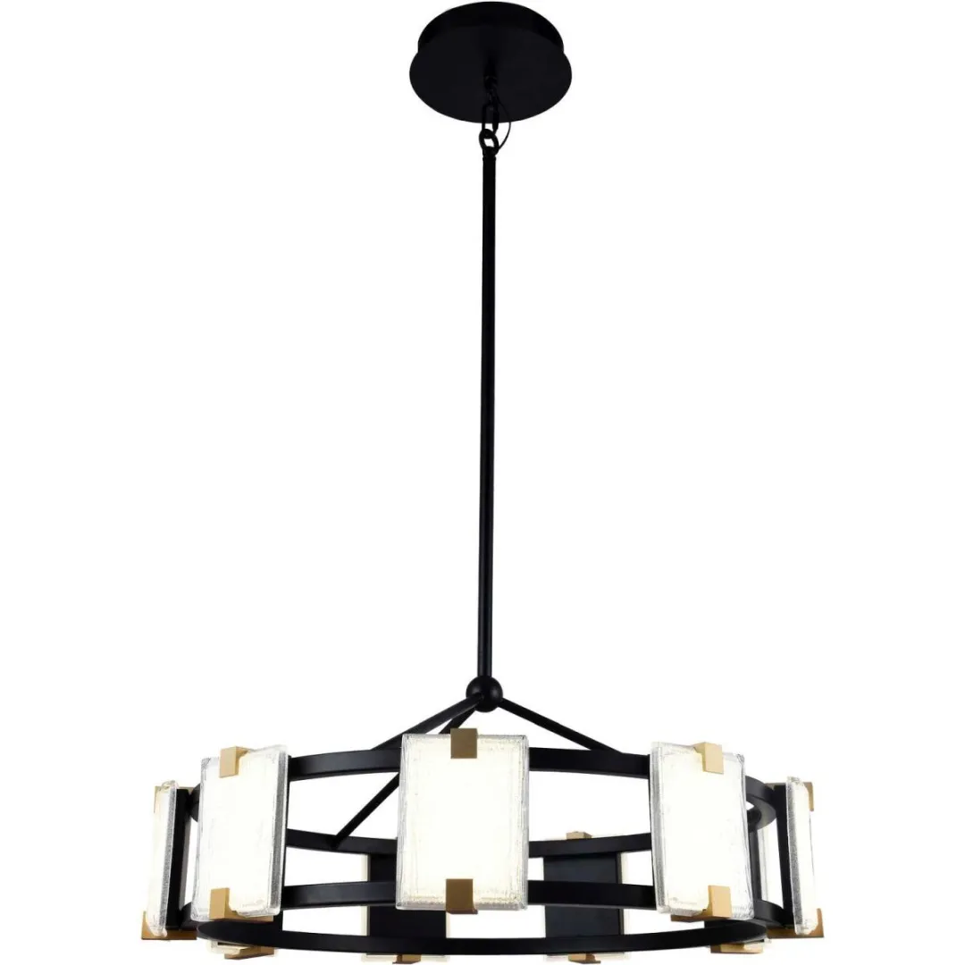 Люстра подвесная из коллекции Crown выполнена из металла, окрашенного в черный цвет. Светодиодные источники света закрыты матовыми плафонами из фактурного стекла. Плафоны закреплены держателями, окрашенными в цвет золота.
