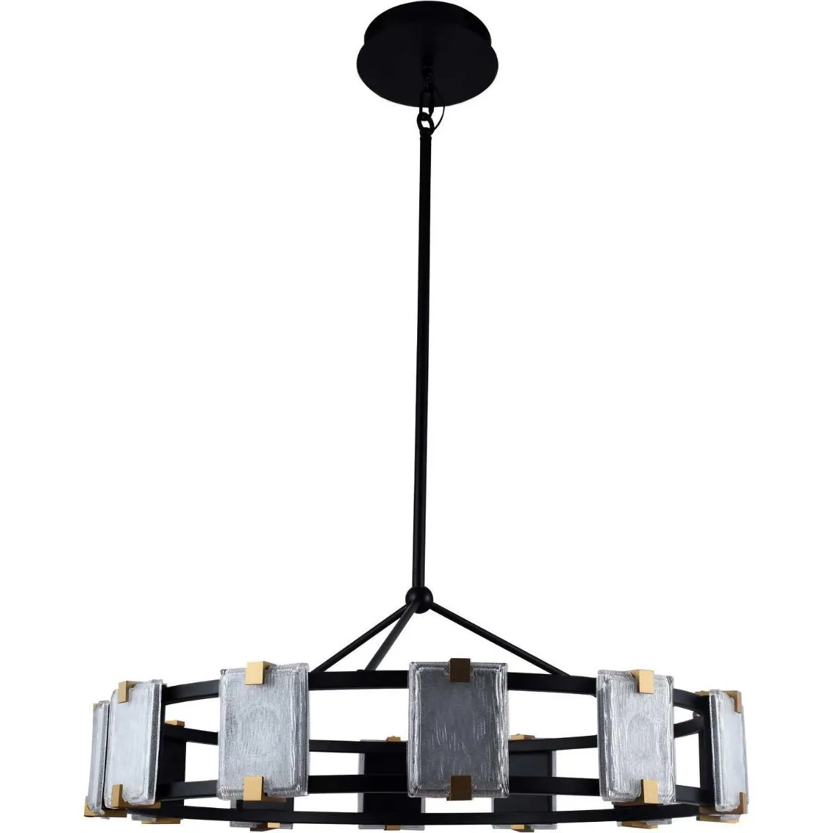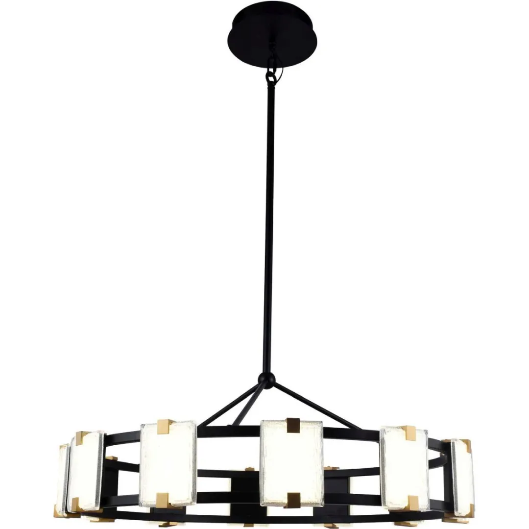 Люстра подвесная из коллекции Crown выполнена из металла, окрашенного в черный цвет. Светодиодные источники света закрыты матовыми плафонами из фактурного стекла. Плафоны закреплены держателями, окрашенными в цвет золота.